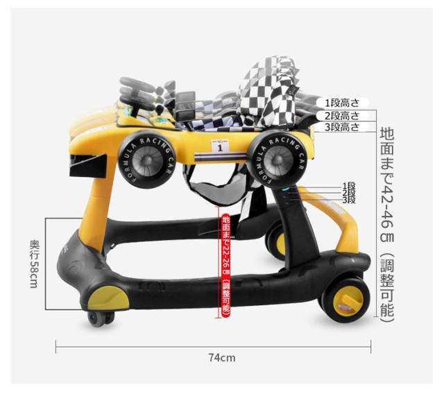 | サイズについての説明 | 1.キャスターの取り付け (1)本体ベースを裏返しにして、キャスター取付け穴にキャスターを取り付けます。(全4ケ所) (2)片手で本体ベースを支えながら、キャスターを取付穴の奥までしっかりと差し込んで下さい。 (3)歩行器を元に戻し、前後左右に動かして、キャスターが正しくしっかりと取り付けられたことを確認して下さい。 2.テーブル&座シートを取り付けます 3.テーブル側のホイール(全4ケ所)を取り付けます 4.メロディボードの取り付け (1)メロディボード裏側の電池ボックスに単3電池(別売)3個を+、−の方向を確認して入れてください。 (2)メロディボードのツメを本体の凹みに合わせて差込み、前側を上から押付けてください。 5.両サイドのフレームのボタンを押して、3段階の高さ調節が可能なので赤ちゃんの身長に合わせて歩く練習ができます。 6.後ろ側のホイール を回せば、お子さまの力に合わせてスピードを調節できます。 7.お子さまが大きくなれば、車の後ろにあるハンドルバーを持ち上げて、本体ベースと座シートを取り外せば手押し車として使えます。 |