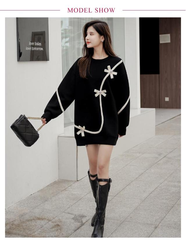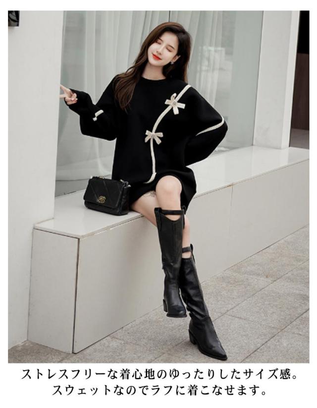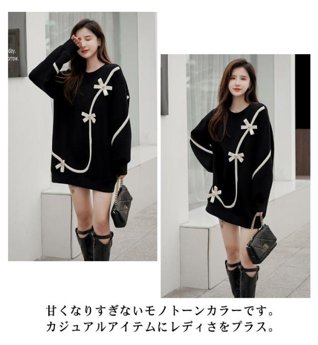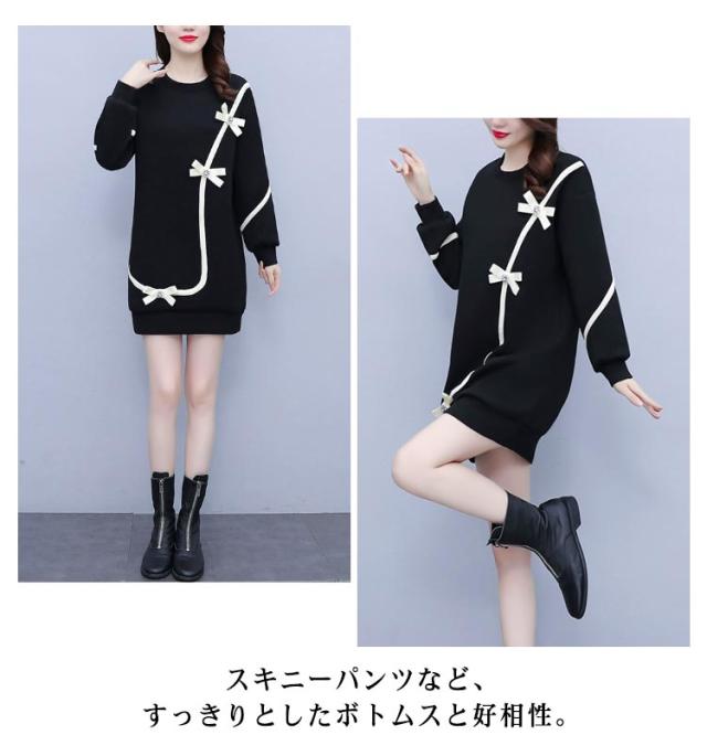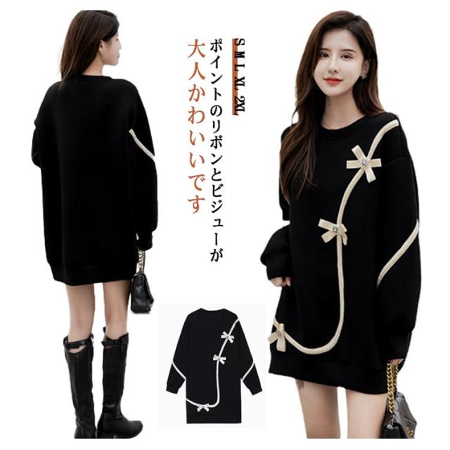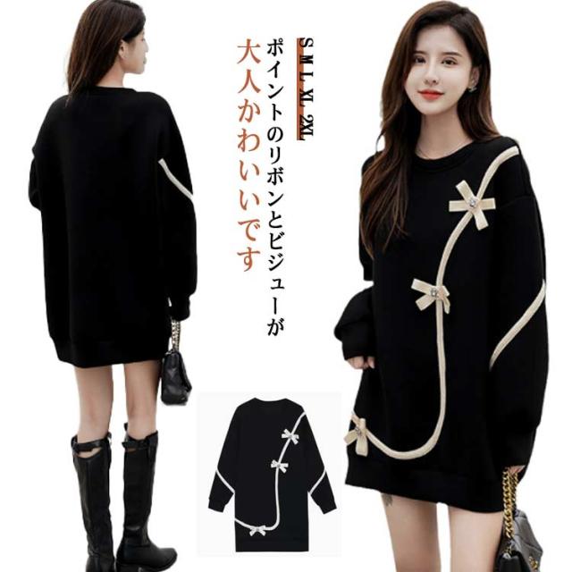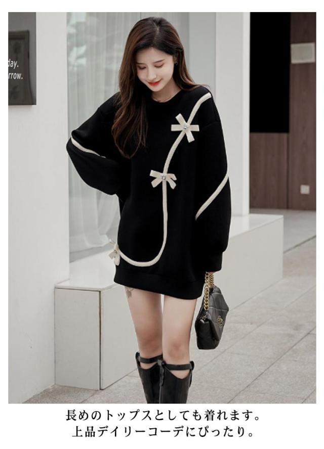 スウェット ワンピース ラウンドネック 長袖 ショート丈 リボン スウェットワンピ チュニック トップス ボリューム袖 プルオーバー トレーナー 長袖 ゆったり オーバーサイズ 送料無料 きれいめ 上品 キレイ目 美人 休日 ストリート 清楚 デート