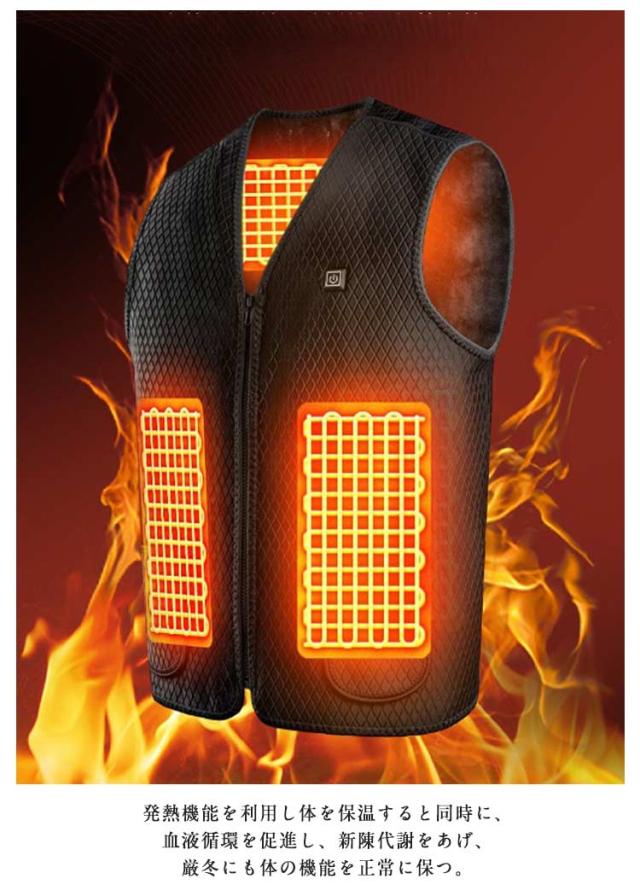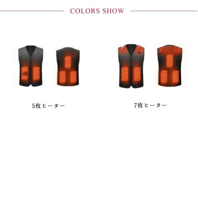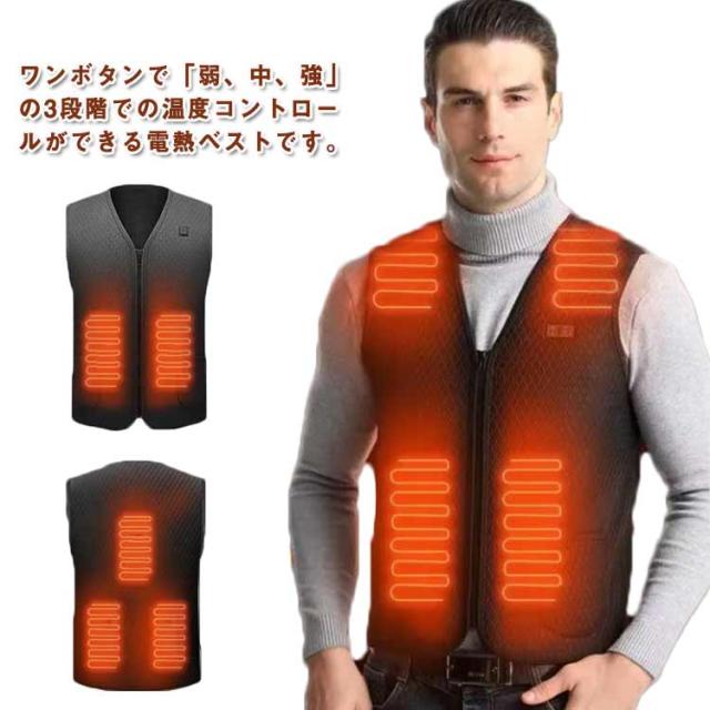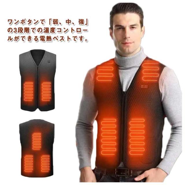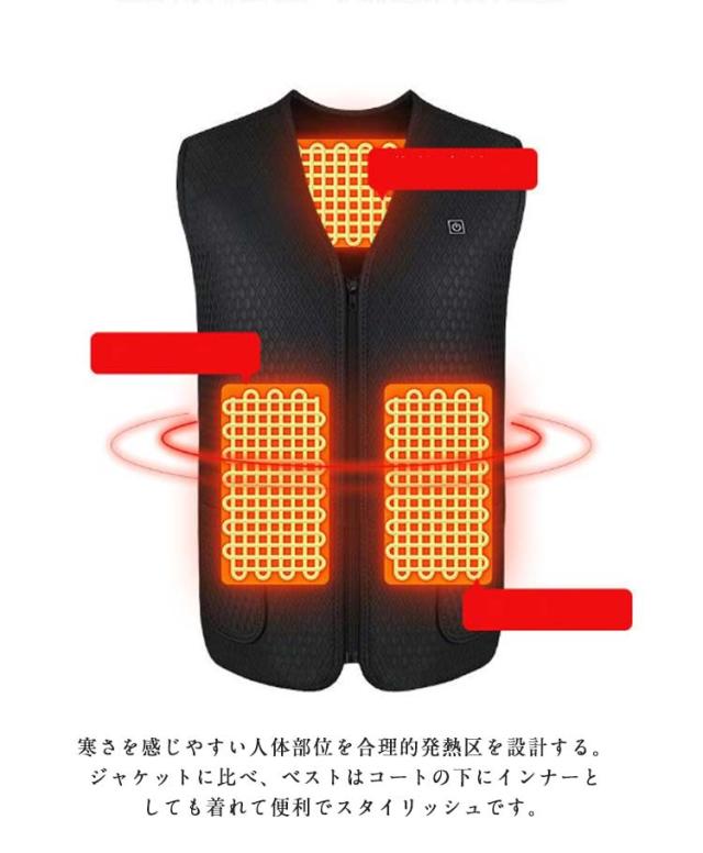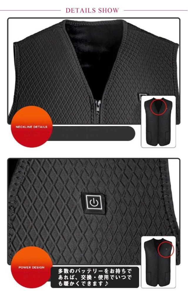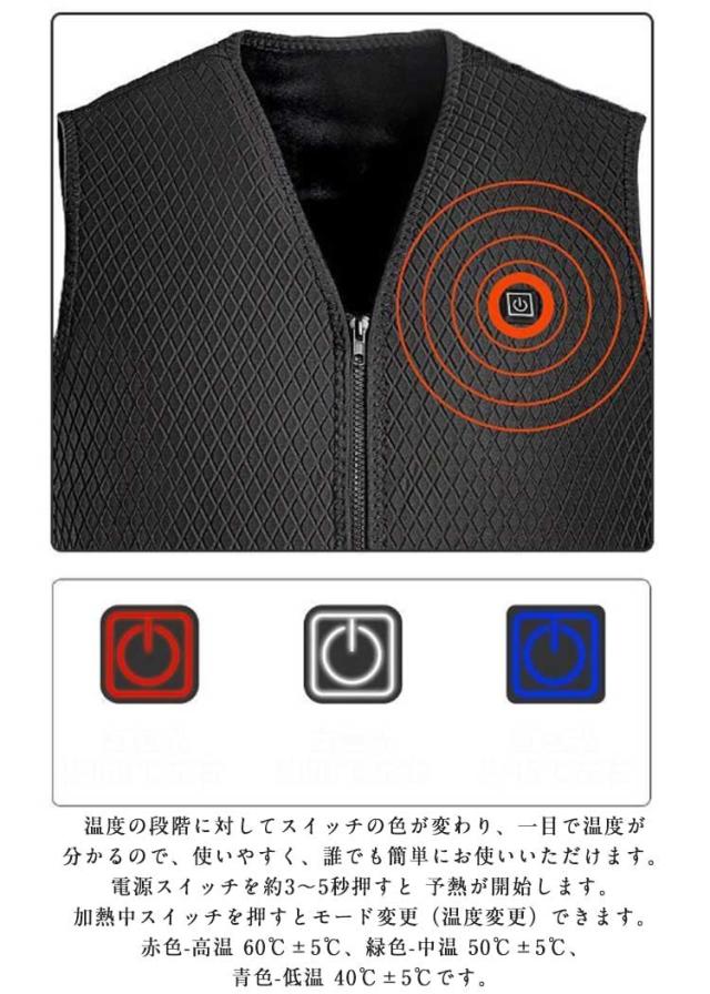 | ワンボタンで「弱、中、強」の3段階での温度コントロールができる電熱ベストです。 USB給電式!(別売り)があればバッテリー電力がある限り加熱ができ、外でも暖かい! 発熱機能を利用し体を保温すると同時に、血液循環を促進し、新陳代謝をあげ、厳冬にも体の機能を正常に保つ。 温度の段階に対してスイッチの色が変わり、一目で温度が分かるので、使いやすく、誰でも簡単にお使いいただけます。電源スイッチを約3〜5秒押すと 予熱が開始します。加熱中スイッチを押すとモード変更(温度変更)できます。赤色-高温 60℃±5℃、緑色-中温 50℃±5℃、青色-低温 40℃±5℃です。 寒さを感じやすい人体部位を合理的発熱区を設計する。ジャケットに比べ、ベストはコートの下にインナーとしても着れて便利でスタイリッシュです。 通勤など普段使いはもちろん、スキー、スノボなどのウィンタースポーツや、遊園地やスポーツ観戦などの屋外のイベント、登山、釣り、キャンプなどのアウトドア活動におすすめです。 多数のバッテリーをお持ちであれば、交換・使用でいつでも暖かくできます♪ | |