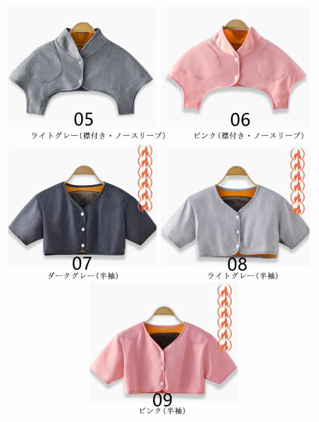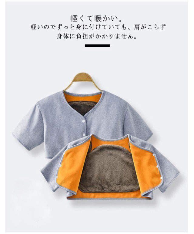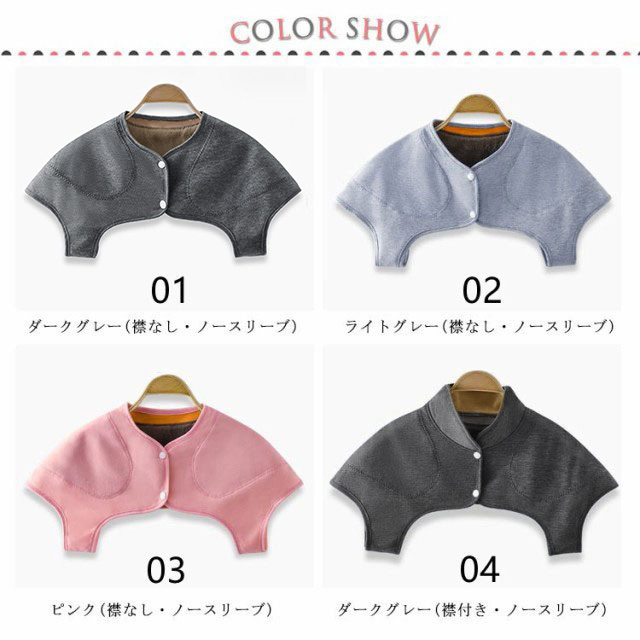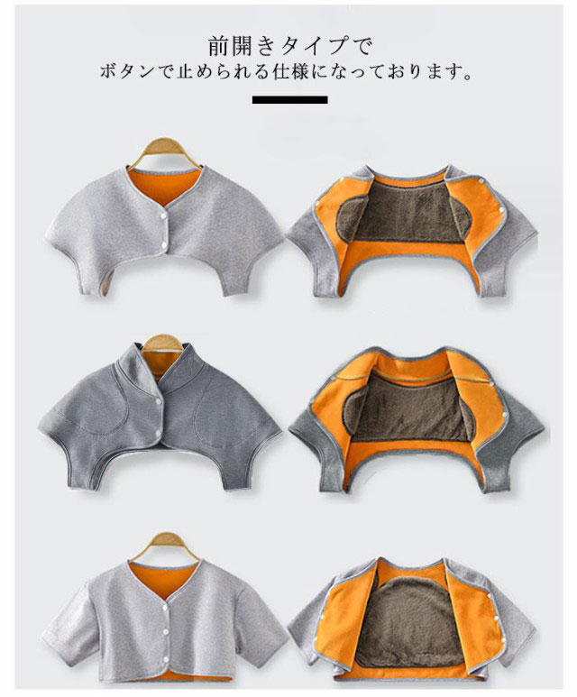 | 【あったか肩当て!ふわふわ裏起毛で防寒対策に!】 【ノースリーブ・半袖・襟付き・襟なしから選べる】 軽くて暖かい。軽いのでずっと身に付けていても、肩がこらず身体に負担がかかりません。 前開きタイプでボタンで止められる仕様になっております。 裏起毛素材で軽くてあたたかい肩当てです。 就寝のときにふとんから肩が出て冷えるのを防ぎます。 贈り物としてもオススメです! | |