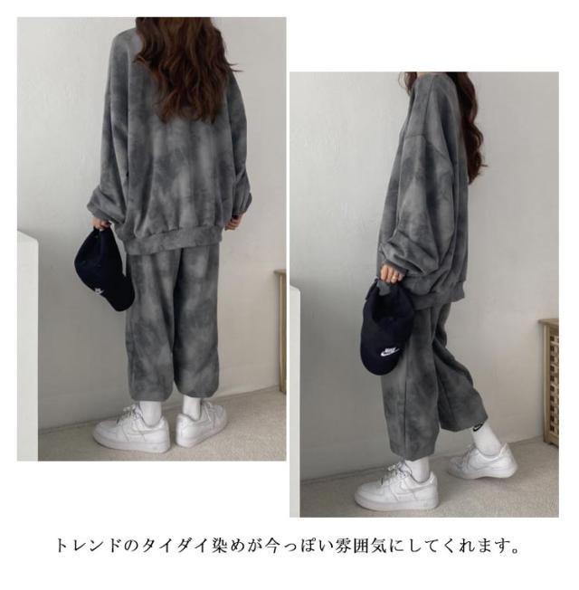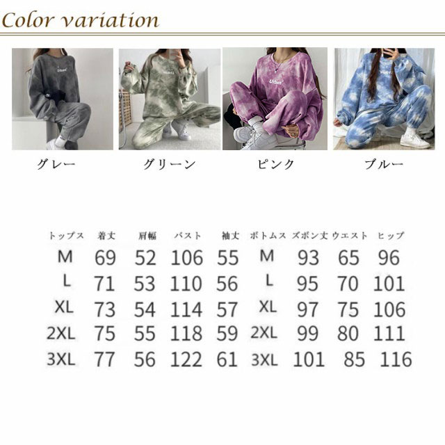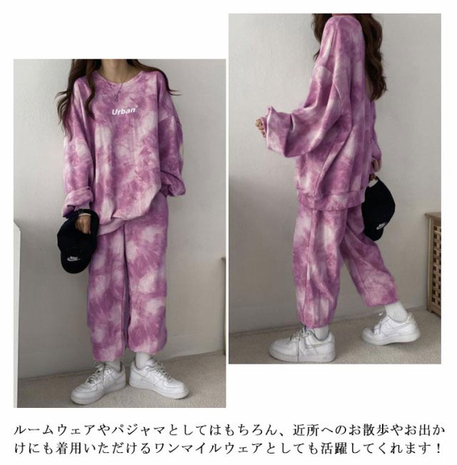 | M-3XL!タイダイ染めした、トレーナー・スウェットパンツ上下セット。 ゆとりのあるサイズ感でリラックス感のある穿き心地が叶う。 トレンドのタイダイ染めが今っぽい雰囲気にしてくれます。 ルームウェアやパジャマとしてはもちろん、近所へのお散歩やお出かけにも着用いただけるワンマイルウェアとしても活躍してくれます! セットではもちろん、上下別々でも使いやすく、コーディネートの幅が広がる嬉しいアイテムです。 | |