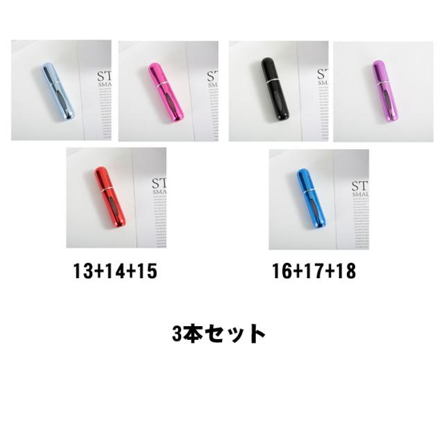 | 【香水詰め替えボトル】【3本セット】【軽量*携帯便利】【18color】 旅行用香水アトマイザーの詰め替えボトルは、アルミニウム合金と耐久性のあるプラスチックの内側で作られているため、耐久性があります。 インナーボトルはガラスのような透明感があり、完全な密封構造により、液漏れを防止します。香水は空気と接触することがなく、揮発を防止します。 コンパクトなサイズで、カバン、引き出しやロッカーに入れても邪魔になりませんので、お出かけや旅行にご使い頂けます。 高級感のある見た目とシンプルなデザインを兼ね備え、男女を問わず違和感なくご利用いただけます。 香水だけだなく、フレッシュナー、純露、ヘア&ボディミスト、口臭ケア、芳香剤、化粧水などの用途は多様です。 【使用方法】 1.お手持ちの香水のヘッド部分を取り外します。 2.ヘッドノズル部とアトマイザーの底部をセットします。 3.香水を抽出。2/3程度で止めるように優しくプッシュします。 | |