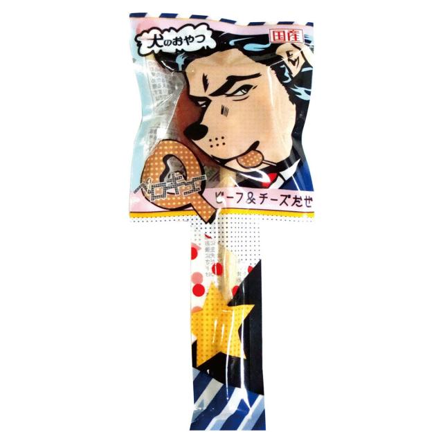 わんわん ペロQ ビーフ&チーズ まるまる一本食べられるペロペロキャンディ型のおやつです。毎日一本、わんちゃんのごほうびに。棒の部分はガム、頭の肉部分が硬すぎないお肉(ベースはビーフ+角切りチーズ)で出来てます。