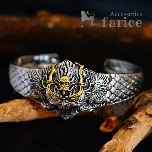 不動明王の使い 烏天狗 カラス 龍 鱗模様 魔除け 厄除け いかつい かっこいい 燻し 太め メンズバングル ブレスレット