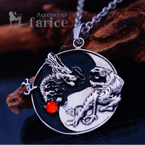 龍と虎 勝負 勾玉 陰陽 トラ 龍 赤玉 メンズアクセ リバーシブル メダル 薄型プレート メンズ ネックレス