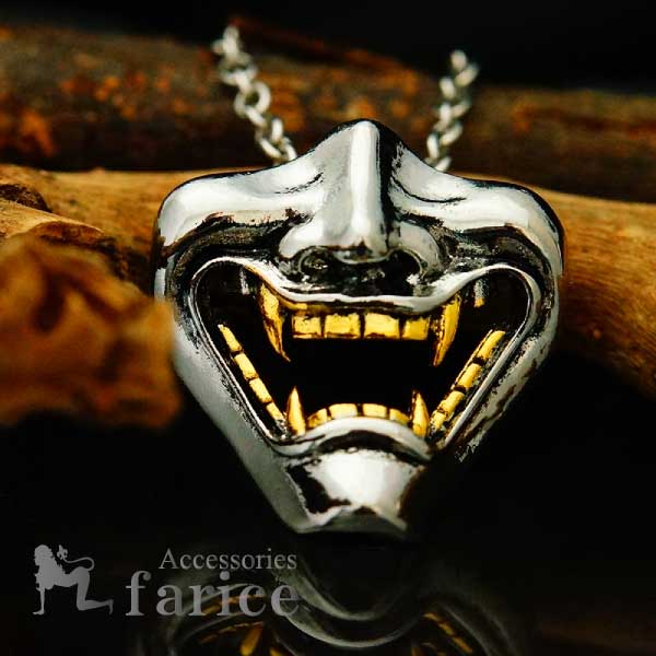 日本 和風 戦国武将 面頬 口面 金歯 般若の口元 ハーフ いかつい 怒り 金色の牙 ペンダント ネックレス メンズネックレス