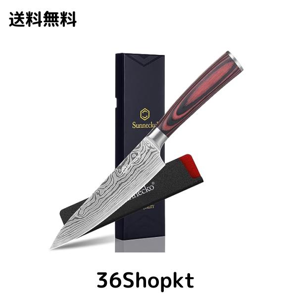 Sunnecko 包丁 牛刀 140mm ステンレス 鞘付き 木柄 料理包丁 切れる包丁 両刃 ダマスカス模様 おしゃれ 贈り物 (シェフナイフ140mm)