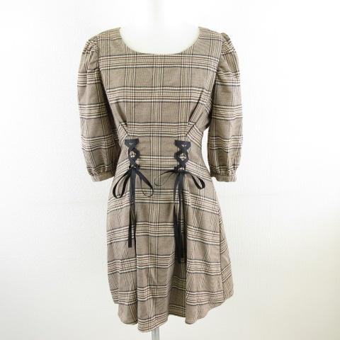 【中古】エブリン evelyn ワンピース 七分袖 チェック ミニ 茶 白 M *A636 レディース
