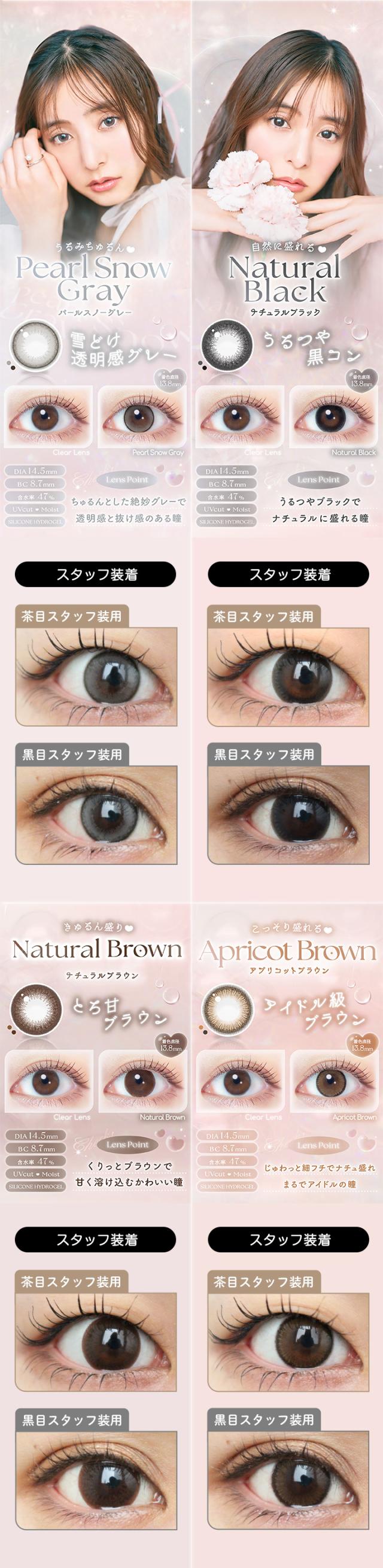 ■カラー:パールベージュ、パールスノーグレー、ナチュラルブラウン、ナチュラルブラック、アプリコットブラウン、ピュアマカロン、シロップリング、ベイビードロップ、ミルクブラウニー、テディモカ