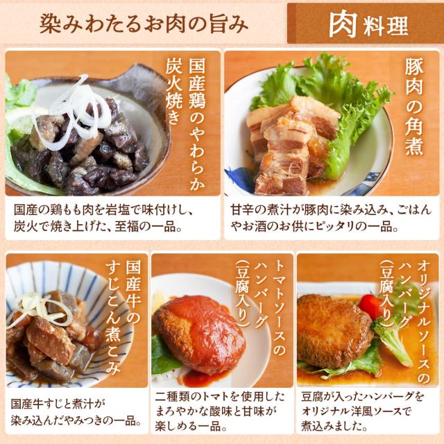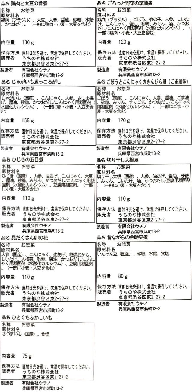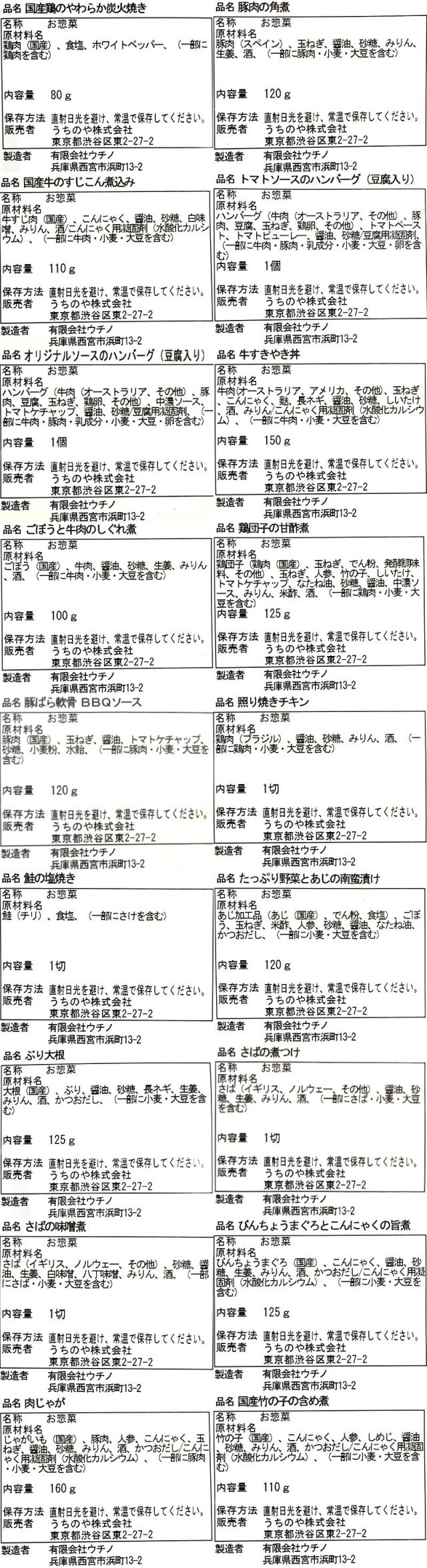 | 内容量 | ■ うちのや 国産鶏やわらか炭火焼き 80g 豚肉の角煮 120g 国産牛のすじこん煮こみ 110g トマトソースのハンバーグ(豆腐入り) 1個 オリジナルソースのハンバーグ(豆腐入り) 1個 牛すきやき丼 150g ごぼうと牛肉のしぐれ煮 100g 鶏団子の甘酢煮 125g 豚ばら軟骨 BBQソース 120g 照り焼きチキン 1切 鮭の塩焼き 1切 たっぷり野菜とあじの南蛮漬け 120g ぶり大根 125g さばの煮つけ 1切 さばの味噌煮 1切 びんちょうまぐろとこんにゃくの旨煮 125g 肉じゃが 160g 国産竹の子の含め煮 110g 鶏肉と大豆の旨煮 180g ごろっと野菜の筑前煮 120g じゃがいも煮っころがし 170g ごぼうとこんにゃくのきんぴら風(ごま風味) 120g ひじきの五目煮 110g 切り干し大根煮 110g 具だくさん卯の花 110g 昔ながらの金時豆煮 80g ひとくちふかしいも 75g 27種 27食 |