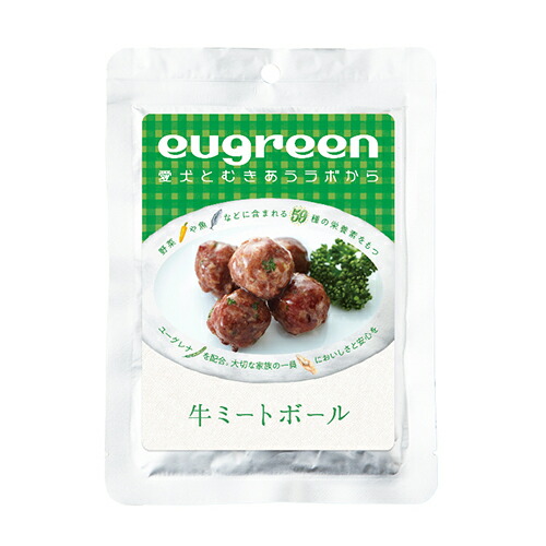 ユーグリーン お惣菜 牛ミートボール香味野菜風味 愛犬の食卓にも彩を。嗜好性が高く、水分もたっぷり。手作り食のトッピングにもおすすめです。牛肉を原材料とした、ミートボールです。1袋にミートボールが5個入りで、お得感があります。牛肉はほかの肉よりもカロリーが高めなので、活発な愛犬におすすめ。香味野菜風味に仕上げ、鉄分が豊富なパセリも添えられているので、食が細くなってきたシニア犬に与えるのには最適です。