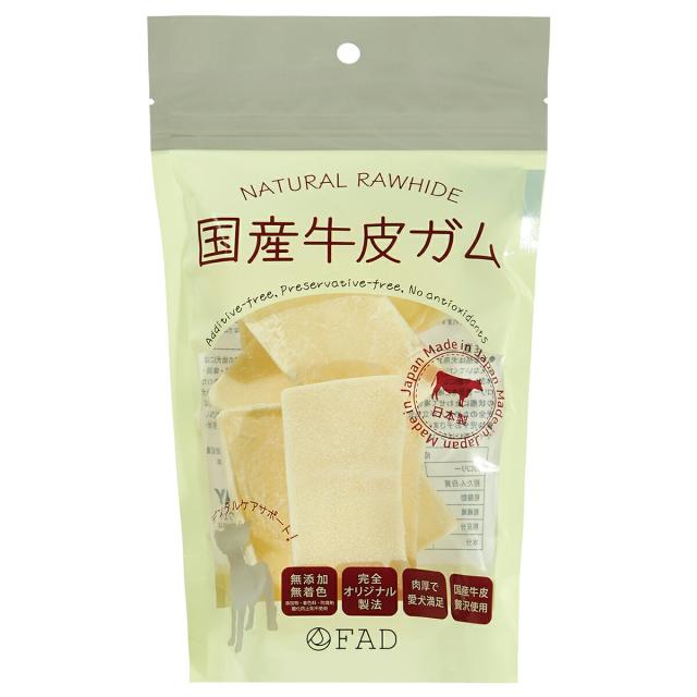 ファッド FAD 国産牛皮ガム チップス 国内で食用に飼育された牛の皮を贅沢に使用。加工から管理まで、すべての工程を一貫して国内で行った、完全国産の無添加牛皮ガムです。原皮から調達した牛皮を、検証を重ねた完全オリジナル製法で製造。通常使用されることのない、上皮(銀面)付近までの使用を実現しました。