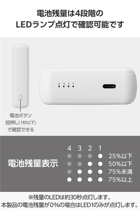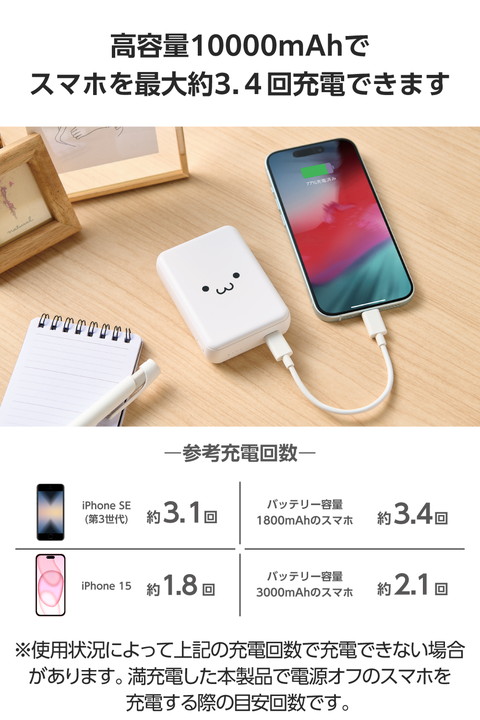 クレジットカードとほぼ同じ大きさで、約200gと軽量ながら容量は10000mAh。スマートフォンを約1.8回満充電できる安心の大容量。かばんに忍ばせていつでも持ち歩ける、コンパクトタイプのモバイルバッテリーです。 ※3000mAhのスマートフォンの充電可能回数の目安です。![]() ■小さくて軽く、持ち運びにぴったり。15W出力、容量10000mAhのコンパクトなモバイルバッテリーです。 ■クレジットカードとほぼ同じ大きさで、バッグに入れてもかさばらず、気軽に持ち歩けるサイズです。 ■モバイルバッテリー本体を約4時間20分で充電できます。 ■※5V/3AのAC充電器にUSB Type-C(TM) - USB Type-Cケーブルを接続し、製品本体のみを充電した場合の目安時間です。 ■最大3Aの出力が可能な高出力モデルです。 ■本製品(バッテリー容量10000mAh)で、1800mAhのスマートフォンを約3.4回、3000mAhのスマートフォンを約2.1回充電可能です。 ■※満充電した本製品で電源オフの状態のスマートフォンを充電する際の目安回数です。充電中に電源を入れたり、機器を使用したりしている場合は記載の数値まで充電できない場合があります。 ■iPhone 14までの機種に付属もしくは対応したケーブルを利用することで、Lightningポート搭載のiPhoneも充電可能です。 ■電池残量は4段階のLEDランプ点灯で確認可能です。 ■約500回繰り返し使用可能な充電式リチウムイオン電池を搭載しています。 ■内蔵の充電式リチウムイオン電池は、JIS C8711およびJIS C8712(JIS C8714の内容を含む)に準拠した安全設計です。 ■日本の電気用品安全法(PSE)の技術基準に適合した安全性の高い商品です。 ■過充電・過放電・過電流防止機能および短絡保護機能と温度検知機能の5つの保護機能を備えた安心の回路設計です。 ■※工場出荷時に70%程度充電されています。充電式リチウムイオン電池は時間とともに放電するので、ご使用になる前に充電することを推奨します。 ■※USB Type-C and USB-C are trademarks of USB Implementers Forum ■自社環境認定基準を1つ以上満たし、『THINK ECOLOGY』マークを表示した製品です。 ■環境保全に取り組み、製品の包装容器におけるプラスチック重量を、社内基準製品より20%以上削減した製品です。 ■環境保全に取り組み、製品の包装容器が紙・ダンボール・ポリ袋のみで構成されている製品です。 ■環境保全に取り組み、製品本体の主たる構成部品や構成要素の原料に占めるリサイクル原料の割合が10%を超えている製品です。 ■本製品は、一般社団法人JBRCの回収対象製品であり、回収協力自治体や協力店(家電量販店・HCなど)で回収が可能です。 ■※JBRCのホームページでお住まいの地域の回収協力自治体・協力店をご確認ください。 ![]() ■対応機種:iPhoneおよびUSB Type-C(TM)端子で充電するスマートフォン、タブレット、他小型電子機器 ■コネクター形状(電源入力側):USB Type-Cポート ■定格入力電圧:5V ■定格入力電流:3A ■コネクター形状(電源出力側):USB Type-Cポート×1 ■定格出力電圧:5V ■定格出力電流:3A ■電池種類:充電式リチウムイオン電池 ■電池定格容量:3.7V/10000mAh 37.0Wh ■充電時間:約4時間20分 ※5V/3AのAC充電器とUSB Type-C - USB Type-Cケーブルを使用した場合 ■外形寸法:幅約63.4mm×奥行約23.5mm×高さ約89.5mm ■重量:約200g ■カラー:しろちゃん(ホワイト×ブラック) ■くり返し使用回数:500回 ■電気用品安全法:○PSE 特定以外の電気用品 ■保証期間:1年間 ■その他:ケーブルは付属しておりません、別途ご用意ください。 |