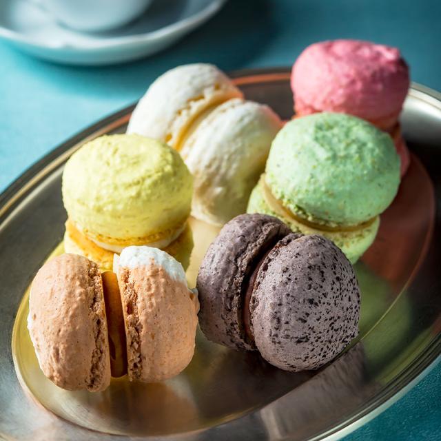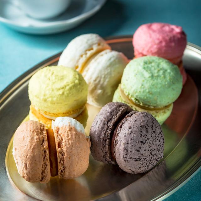 コロンとした形とやさしい色合いが印象的。軽やかな食感とともにアーモンドの風味が際立つマカロンは、「粗挽き」のアーモンドパウダーを使うのが鍵。中に挟んだまろやかなクリームの甘みも広がって、なんとも優雅な味わい。キャラメルサレやバニーユなど6種入り。