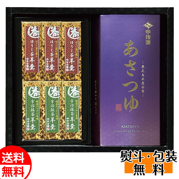 【内容】緑茶(あさつゆ)/100g、抹茶一口羊羹/48g×3、ほうじ茶一口羊羹/48g×3