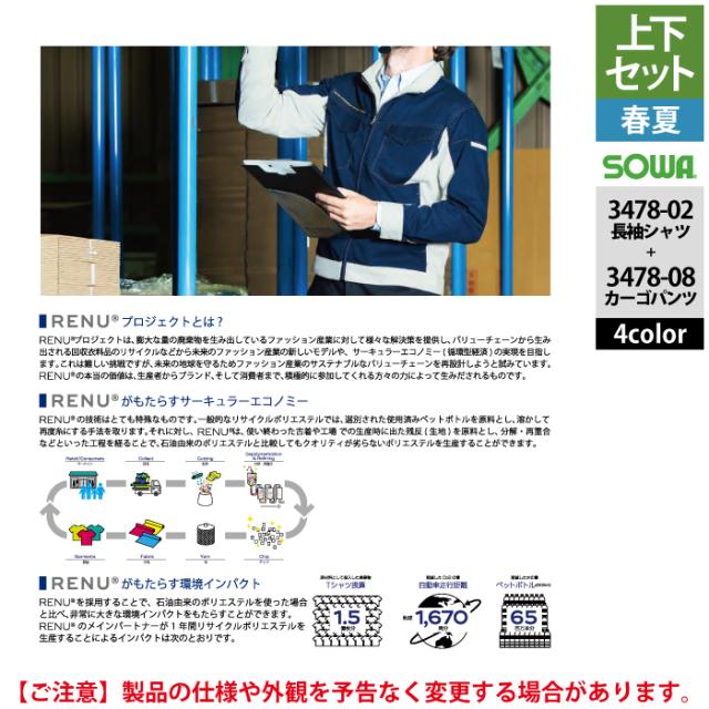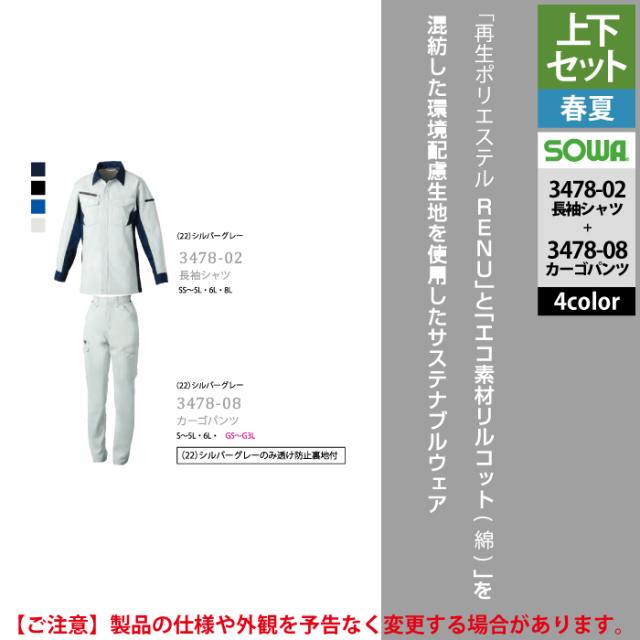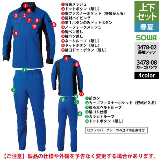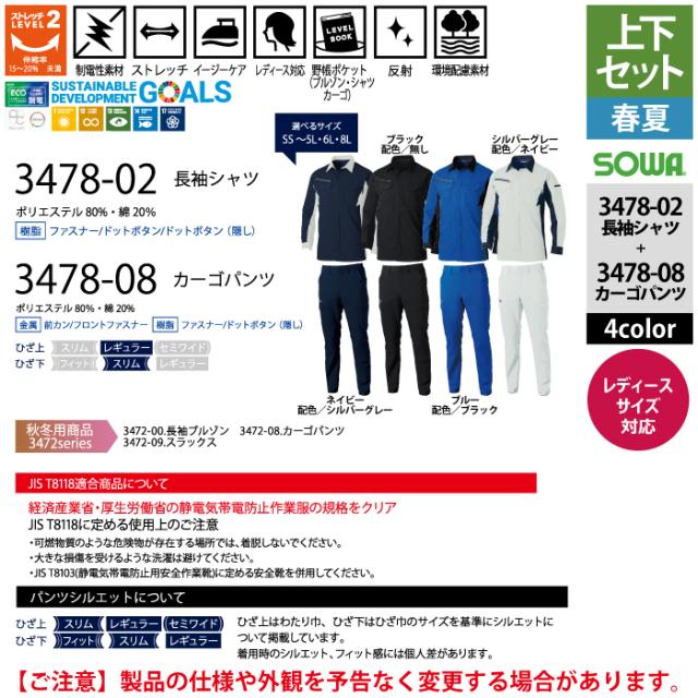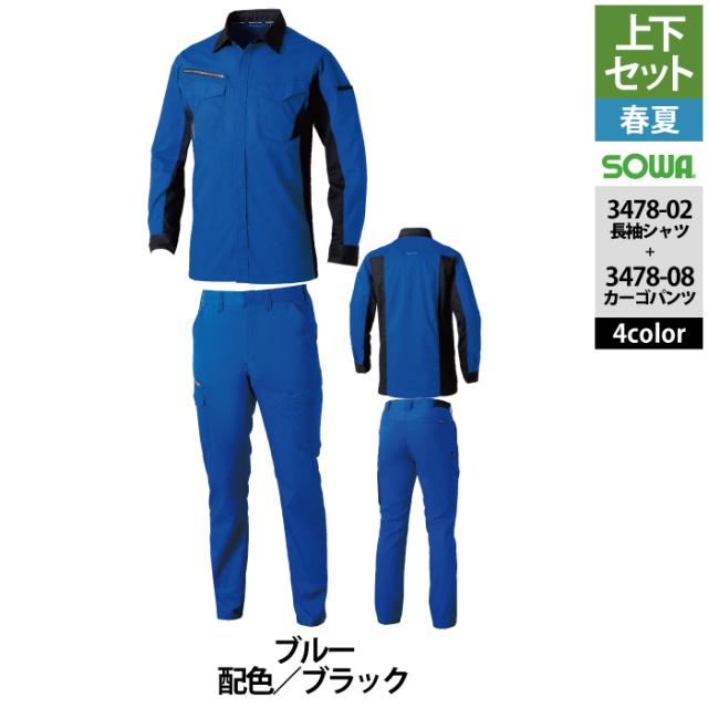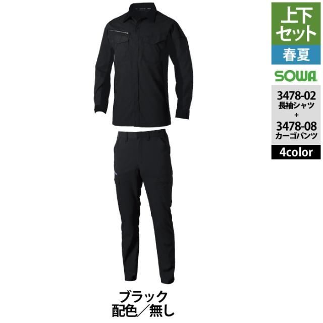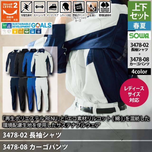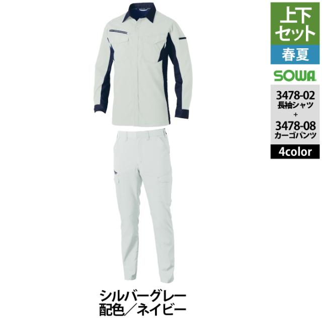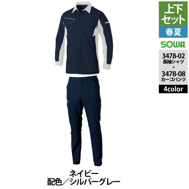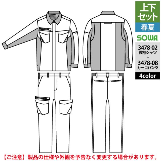 桑和 SOWA 作業服 上下セット 3478-02 長袖シャツS-3L と 3478-08 カーゴパンツ GS-3L 作業着 作業ズボン 春夏用