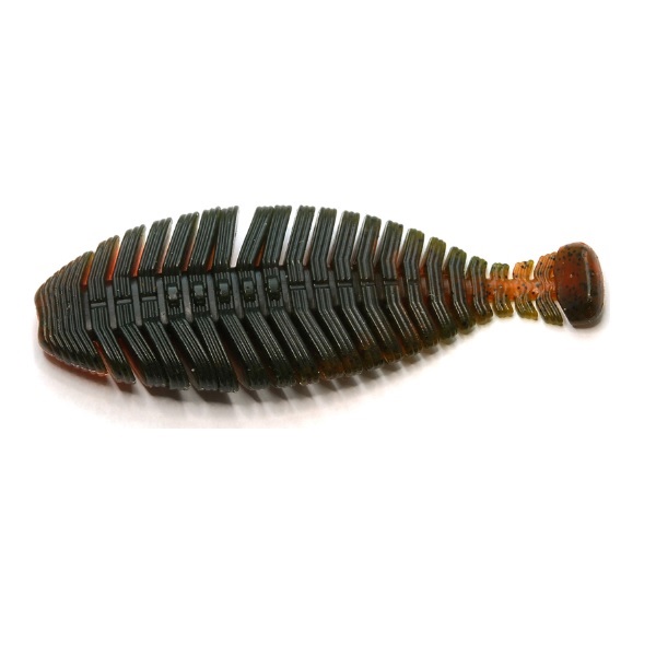フラットボディのソフトベイトが有効である要素のひとつ「強い水押し」とそれに伴う「自発的なイレギュラースライドアクション」。ヒラタイラーは、それらに複雑さと乱水流による艶めかしさをプラスするために、深めのスリットを入れたブロック状の蛇腹ボディに設計。ボディに掛かるウォータープレッシャーの強弱によって全方位にうごめく艶めかしさをもたらしています。また、深めのスリットによってボディ全体でしっかりと水をグリップするため、常に複雑な波動を発しステイ時においても存在をアピール。従来のフラットワームでは生み出しにくかった繊細なロッドワークに対しても、くねるような柔らかな反応で魚を魅了します。スリットによる柔軟なボディは、フラットワームの欠点であるフッキングの悪さの改善にも大きく貢献しています。