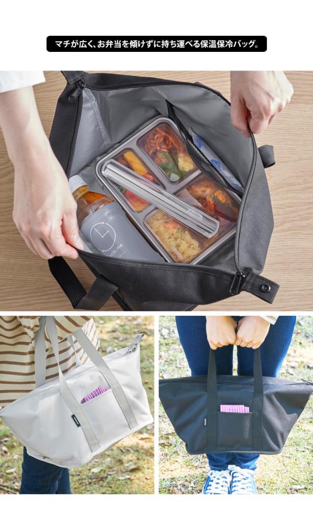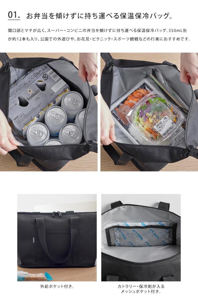開口部とマチが広く、スーパー・コンビニの弁当を傾けずに持ち運べる保温保冷バッグ。350mL缶が約12本も入り、公園での外遊びや、お花見・ピクニック・スポーツ観戦などの行楽におすすめです。入れる中身によってホックの留め方を変えれば、バッグの形が変化。少ない中身の時は、ホックをサイドやセンターで留め、中身に添うような形に変更すれば、お弁当の偏りを防ぐことができます。使い終わった後やシーズンオフには畳んでコンパクトに収納。汚れや、においが気になったらおうちで洗濯機で丸洗いできて衛生的です。(※必ず洗濯ネットを使用してください※ドライコースや手洗いコースで洗ってください)