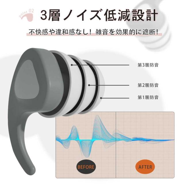 ●3層ノイズ低減設計で、 不快感や違和感を感じずに雑音を効果的に遮断します。外耳道に余分な圧力をかけないので痛みや疲れもありません。