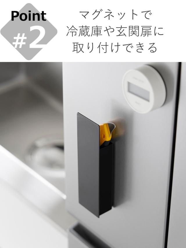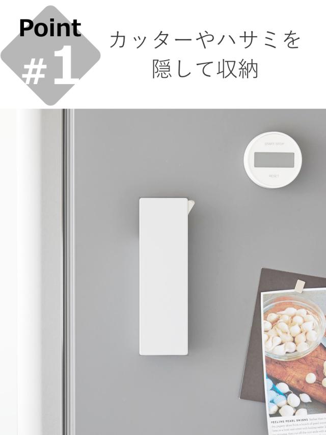 生活感のあるカッターやハサミを隠して冷蔵庫周りや玄関ドアに収納できるカッターホルダーです。目隠し板により、生活感のあるカッターもスッキリ収納できます。
