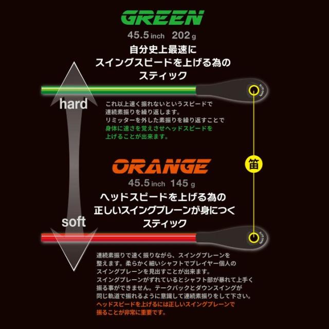 ORANGEとGREENのSPEED PLANEを交互に振ることで正しいスイングプレーンが身につき、