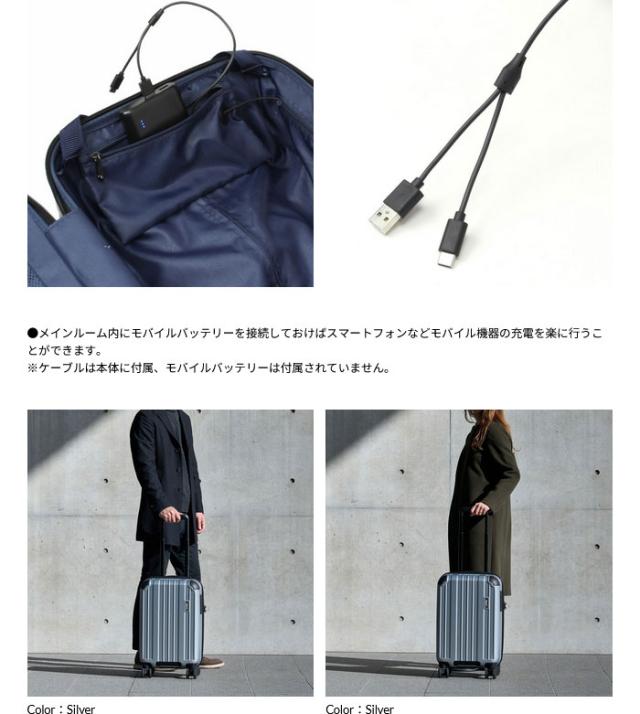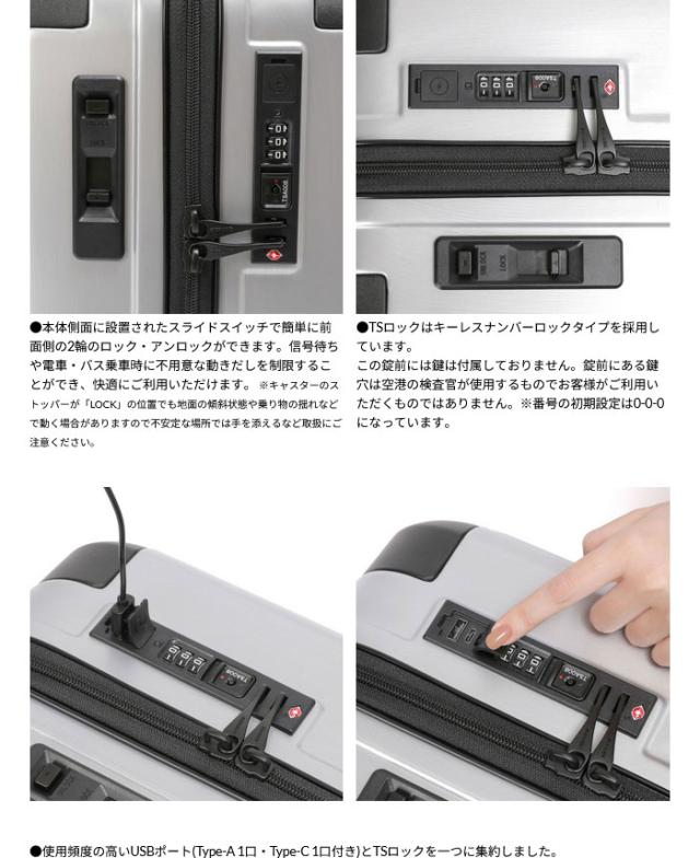 スマートフォンなどの機器の充電に便利なUSBポート2口付きのTSロック(キーレスナンバーロックタイプ)、荷物の紛失時に発見率が向上するトラベルセントリーIDを装備しました。