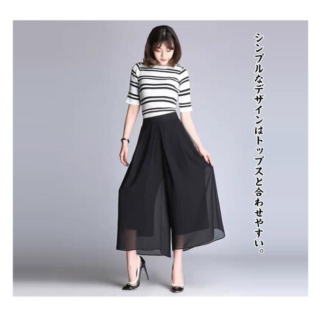 | 裏地には透け防止効果があるので、薄手のワイドパンツも安心して着ることができます。 風にたなびく優雅なシルエットは街中でもリゾート感満載でステキな大人のデザインです。 シンプルなデザインはトップスと合わせやすい。 ゆるやかなシフォン素材は感通しもよく涼しいげで、これからの季節、大活躍! 選べる丈感、好みの長さを楽しんで♪ | |