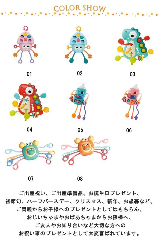 | 握る・つまむ・引っ張る・ねじる・押すなど、指先を使うトレーニングができます。ひっぱるとカチッと音が鳴る。遊び方はさまざま。 カラフルなプッシュポップをポコン! と押して、赤ちゃんの指先を刺激してあげましょう。 おうちではもちろん、車の中、外出先でも大活躍するカラフルなベビートイです。細くて軽いので、3ヶ月の赤ちゃんでも楽々自分で持つことができます。 あかちゃんが舐めたり噛んだりしても安全安心な素材でつくられています。 ご出産祝い、ご出産準備品、お誕生日プレゼント、初節句、ハーフバースデー、クリスマス、新年、お歳暮など、ご両親からお子様へのプレゼントとしてはもちろん、おじいちゃまやおばあちゃまからお孫様へ、ご友人やお知り合いなど大切な方へのお祝い事のプレゼントとして大変喜ばれています。 | |