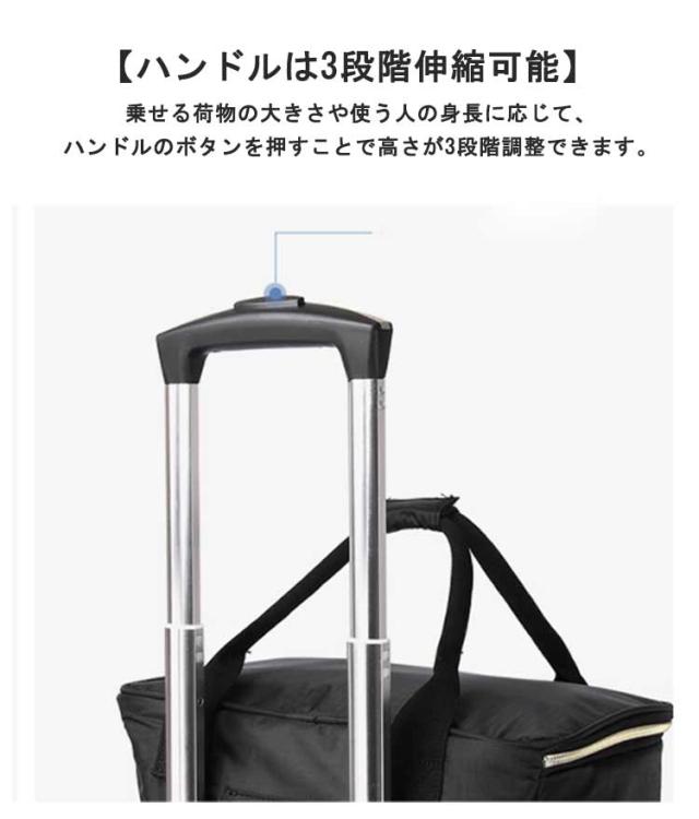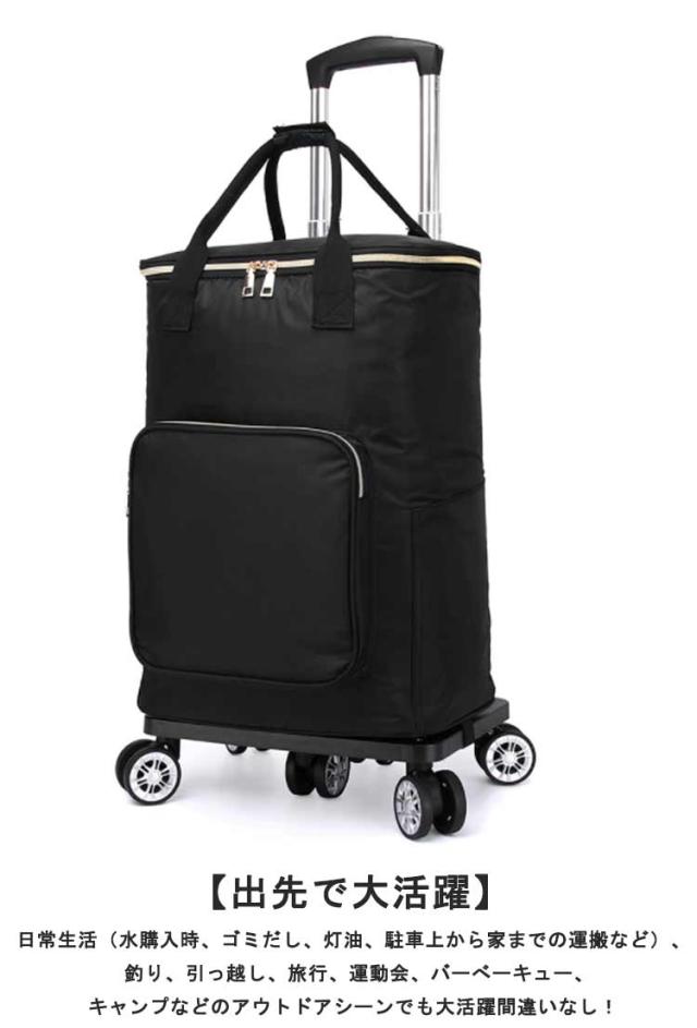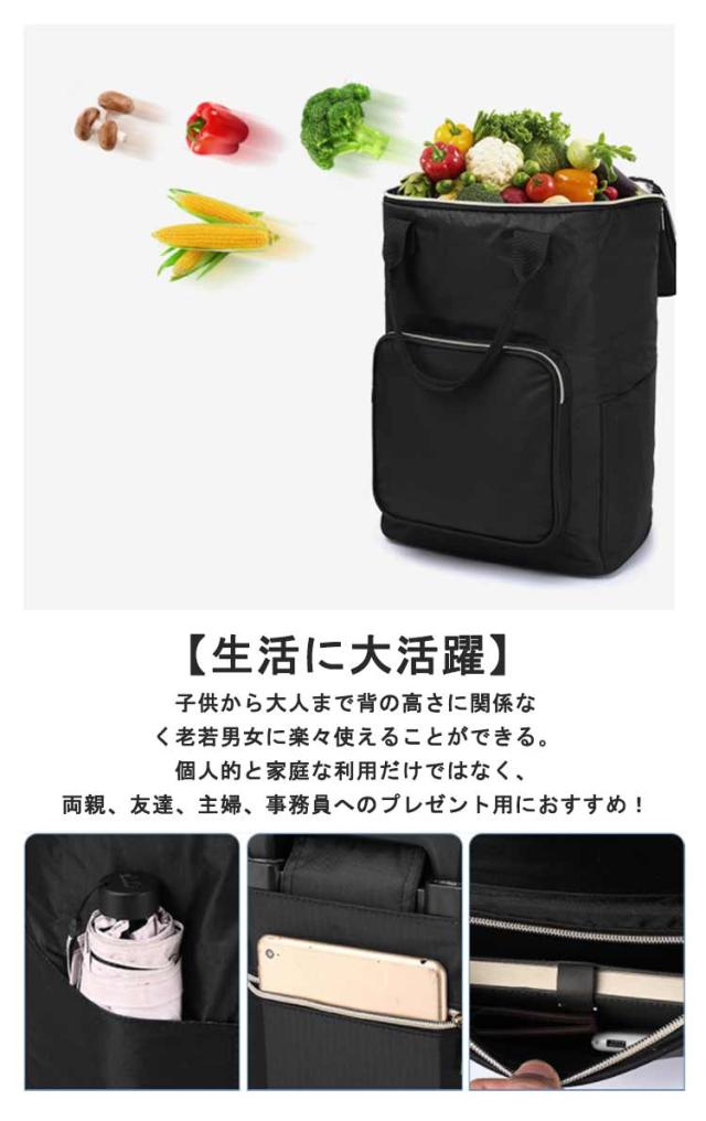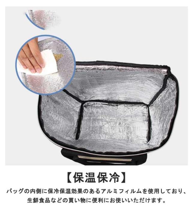| 【保温保冷】バッグの内側に保冷保温効果のあるアルミフィルムを使用しており、生鮮食品などの買い物に便利にお使いいただけます。 【折り畳み収納便利】バッグを取り外して、キャリーを簡単に折り畳んでバッグを入ることができます。使用していない時はコンパクトに折り畳めるので、リビングに置いても場所を取りません。 【大容量】超大容量なので、スーパーの買い物でお米や飲み物など重いものを買った時でも、いつでも楽に運ぶことができます。 【安定感抜群の5輪】耐久性・安定性に優れたタイヤを採用します。360度回転するので、スムーズに方向を変えやすいです。静音設計により、走行時の音が気になりにくいのはメリットです。 【ハンドルは3段階伸縮可能】乗せる荷物の大きさや使う人の身長に応じて、ハンドルのボタンを押すことで高さが3段階調整できます。 【生活に大活躍】子供から大人まで背の高さに関係なく老若男女に楽々使えることができる。個人的と家庭な利用だけではなく、両親、友達、主婦、事務員へのプレゼント用におすすめ! 【出先で大活躍】日常生活(水購入時、ゴミだし、灯油、駐車上から家までの運搬など)、 釣り、引っ越し、旅行、運動会、バーべーキュー、キャンプなどのアウトドアシーンでも大活躍間違いなし! | |