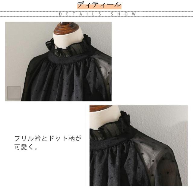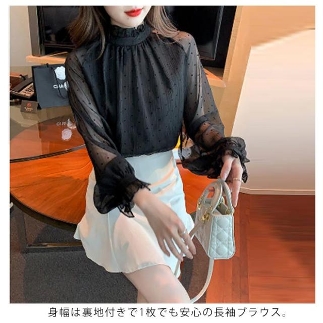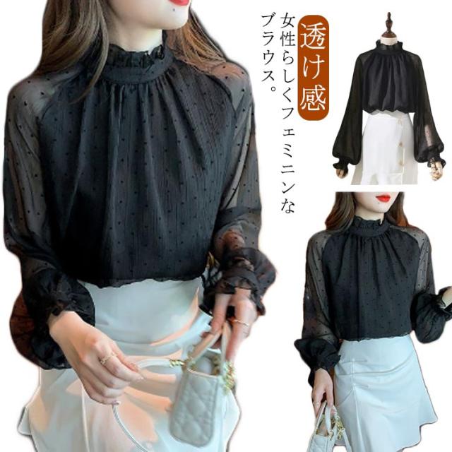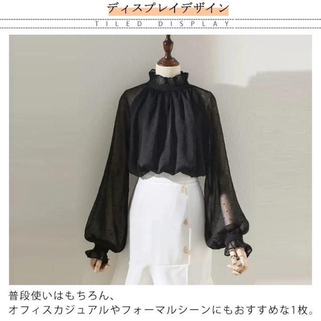 ブラウス きれいめ ぽわん袖 ハイネック フリルネック ブラウス プルオーバー 長袖 透け感 ドット バルーン袖 フォーマル シャツ とろみ ビジネス オフィスカジュアル 送料無料 ギャザーブラウス 入学 卒業 春 夏