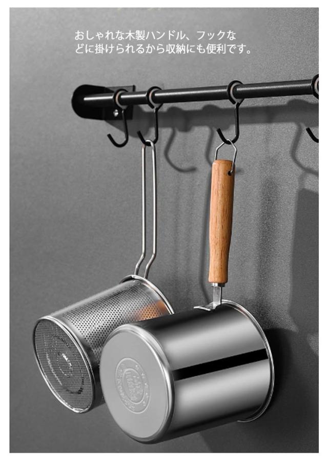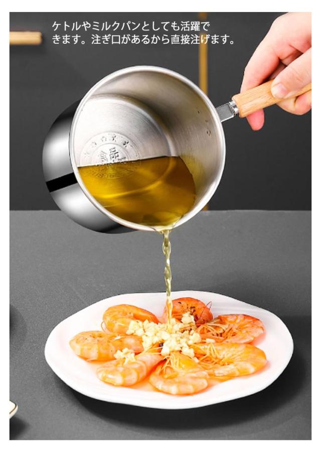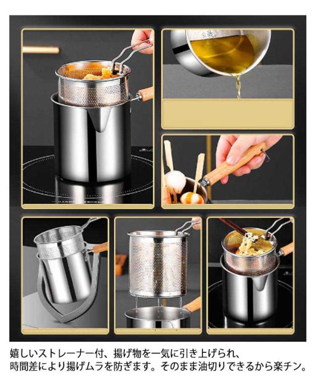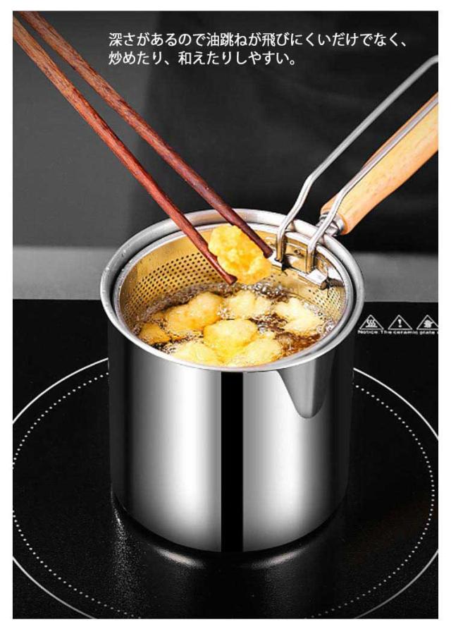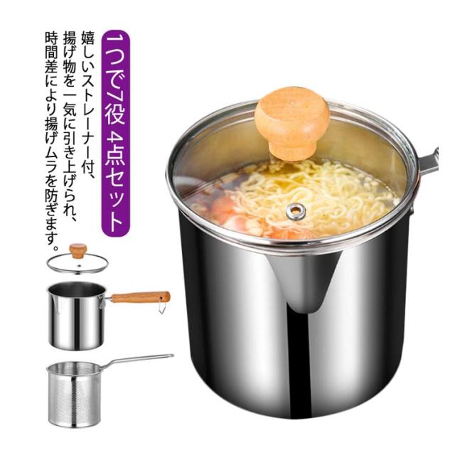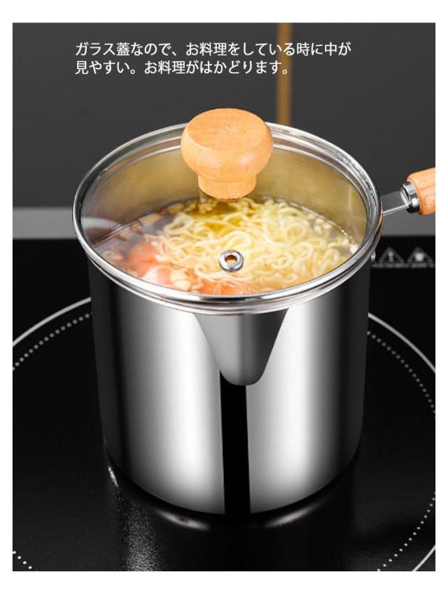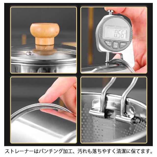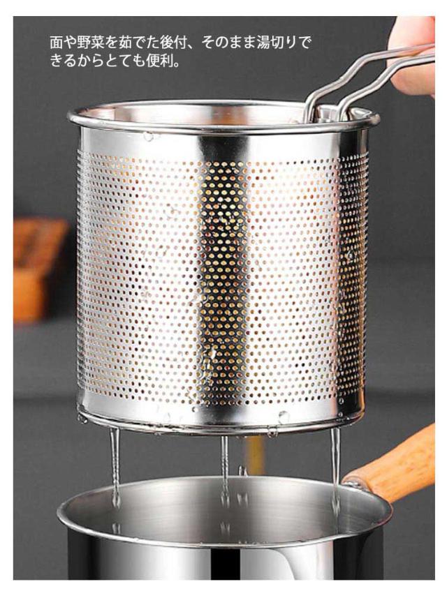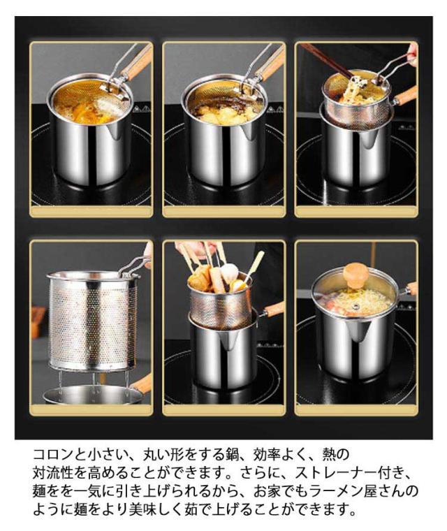 | 1つで7役♪ 沸かす 茹でる 煮る 炒める 揚げる 和える 保存 嬉しいストレーナー付、揚げ物を一気に引き上げられ、時間差により揚げムラを防ぎます。そのまま油切りできるから楽チン。 面や野菜を茹でた後付、そのまま湯切りできるからとても便利。 コロンと小さい、丸い形をする鍋、効率よく、熱の対流性を高めることができます。さらに、ストレーナー付き、麺をを一気に引き上げられるから、お家でもラーメン屋さんのように麺をより美味しく茹で上げることができます。 深さがあるので油跳ねが飛びにくいだけでなく、炒めたり、和えたりしやすい。 ガラス蓋なので、お料理をしている時に中が見やすい。お料理がはかどります。 ケトルやミルクパンとしても活躍できます。注ぎ口があるから直接注げます。 ガス火はもちろん、IHコロンにも使えます。 一人分やお弁当のおかず作りにもちょうどいいサイズ感、そのまま食卓に置いても邪魔にならずオシャレ。 おしゃれな木製ハンドル、フックなどに掛けられるから収納にも便利です。 耐久性に優れた304ステンレス製です。熱伝導が速く、均一な加熱が可能,高温は有害物質を分解せず、衛生的で安全です。 ストレーナーはパンチング加工、汚れも落ちやすく清潔に保てます。 | |