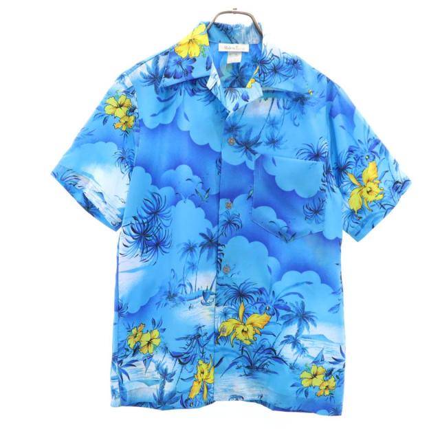 ヴィンテージ 70s 80s ハワイ製 総柄 半袖 アロハシャツ S ブルー VINTAGE メンズ