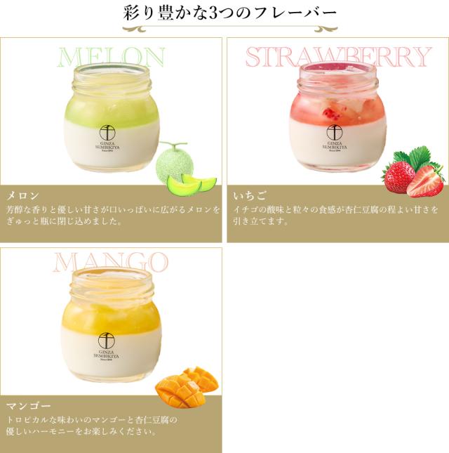【いちご】イチゴの酸味と粒々の食感が杏仁豆腐の程よい甘さを引き立てます。【マンゴー】トロピカルな味わいのマンゴーと杏仁豆腐の優しいハーモニーをお楽しみください。