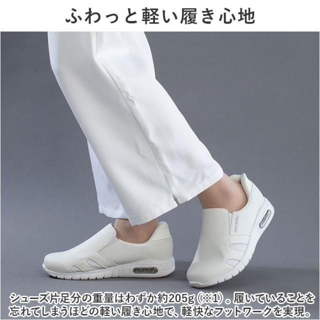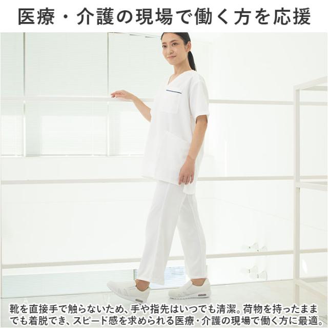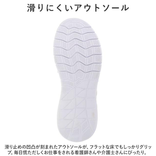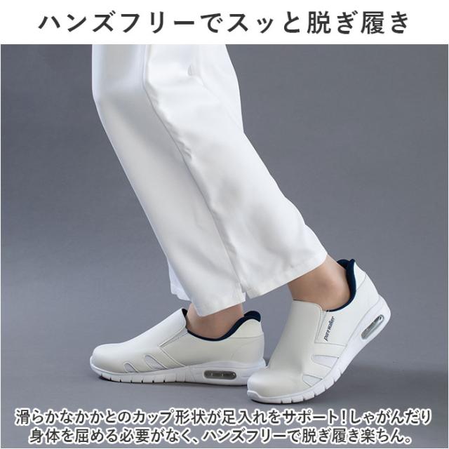 | 商品説明 | ・手を使わずにスッと楽に脱ぎ履き!「Pure Walker -ピュアウォーカー-」から、働く女性を応援する「Slide Fit ハンズフリー ナースシューズ」が新登場。 【話題の Slide Fit シリーズ】 ・つま先がスッと入って、脱ぐときもサッと手間取らない!「Slide Fit -スライドフィット-」は、手を使わずに楽に脱ぎ履きできるシリーズ。 【ハンズフリーでスッと脱ぎ履き】 ・滑らかなかかとのカップ形状が足入れをサポート!しゃがんだり身体を屈める必要がなく、ハンズフリーで脱ぎ履き楽ちん。 【医療・介護の現場で働く方を応援】 ・靴を直接手で触ることがないため、手や指先はいつでも清潔。さらに、荷物を持ったままでも着脱できるなど、スピード感を求められる医療・介護の現場で働く方に最適。 【厚底×エアクッションソール】 ・厚み約3.5cmのソールかかと部分に、エアクッションを内蔵。歩行時の衝撃を優しく吸収し、疲れにくく快適な履き心地。 【ふわっと軽い履き心地】 ・シューズ片足分の重量はわずか約205g(※1)。履いていることを忘れてしまうほどの軽い履き心地で、軽快なフットワークを実現。 【楽ラク!スリッポンスタイル】 ・履き口両サイドのゴムのスリットがぐーんと伸びて、足を滑り込ませるだけで履けるラクラクスリッポンスタイル。 【シューズの中もサラッと快適】 ・アッパー両サイドに目の細かいメッシュ生地の通気孔を設け、ムレを防いでシューズの中はいつでも爽やか。 【安心の抗菌防臭加工】 ・足裏を優しく受け止めるカップインソールには、抗菌防臭効果に加えて、ムレやベタつきを軽減する「HYGRA-UF(ハイグラ-UF)」素材を採用。 【滑りにくいアウトソール】 ・滑り止めの凹凸が刻まれたアウトソールが、フラットなフロアーでもしっかりとグリップ。毎日慌ただしくお仕事をされる看護師さんや介護士さんにぴったり。 【お手入れ楽ちんPUレザー】 ・アッパー部分には、汚れや水滴がサッと拭き取れるPUフェイクレザーを使用。シンプルで清潔感のあるルックスが、様々な場面にフィット。 |