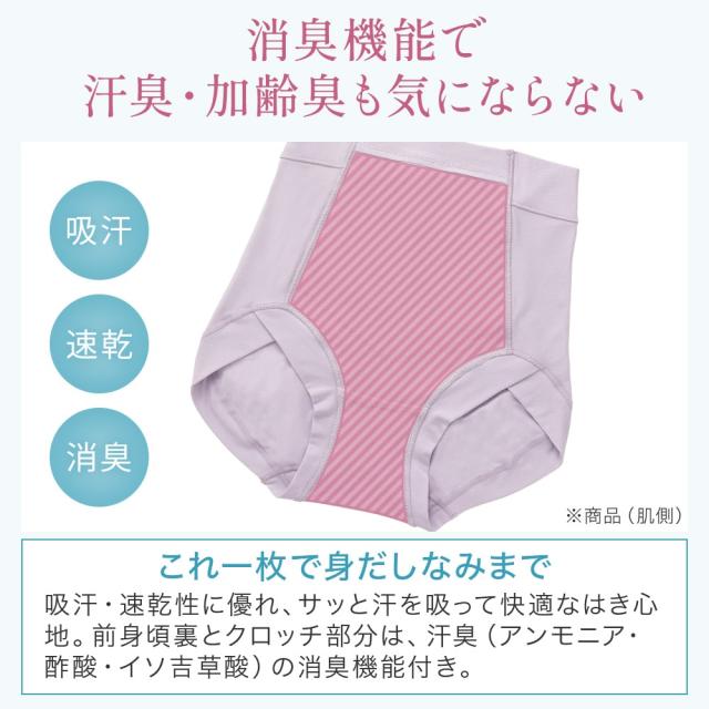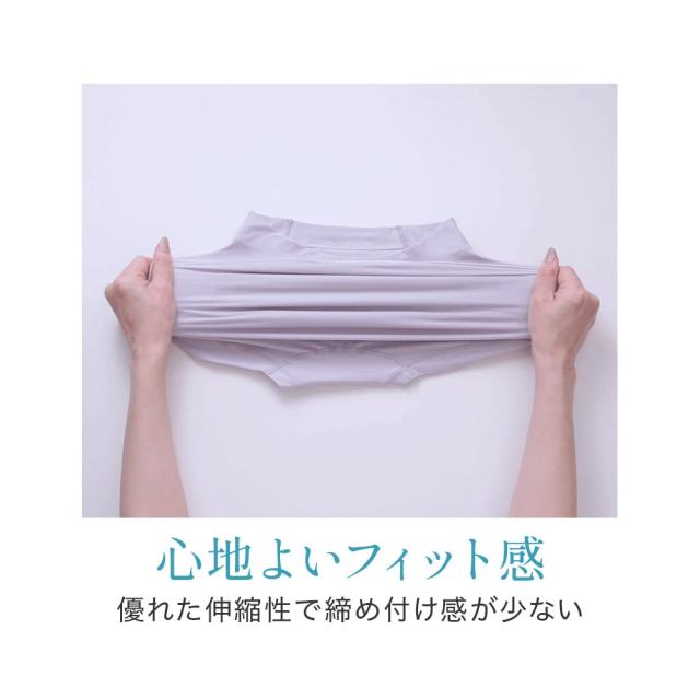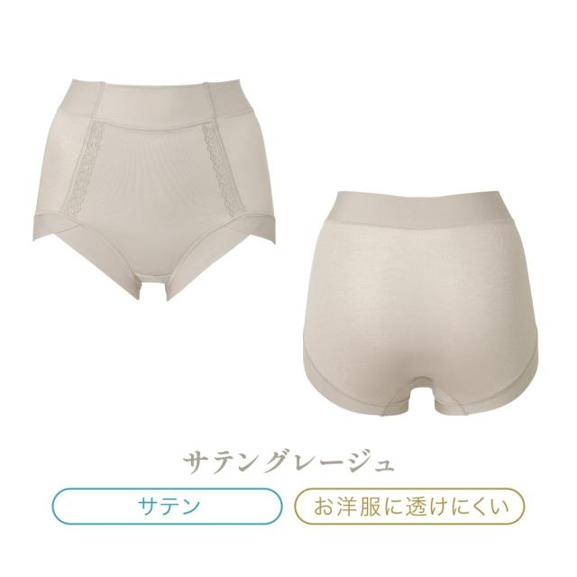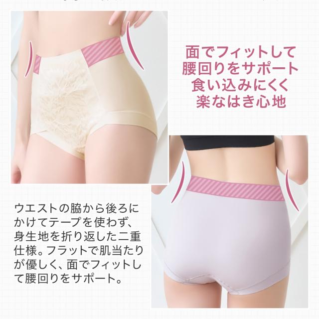 おへそぐらいのはき込み丈で、ウエストからヒップ下までをすっぽり包み込む、安定感のある穿き心地のショーツです。