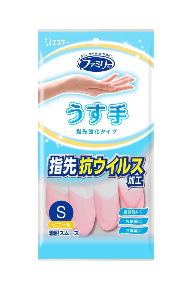【1双販売】エステー PRO ファミリービニールうす手 ピンク 指先抗ウイルス加工 作業用手袋 薄手タイプ 炊事 洗濯 家事 掃除
