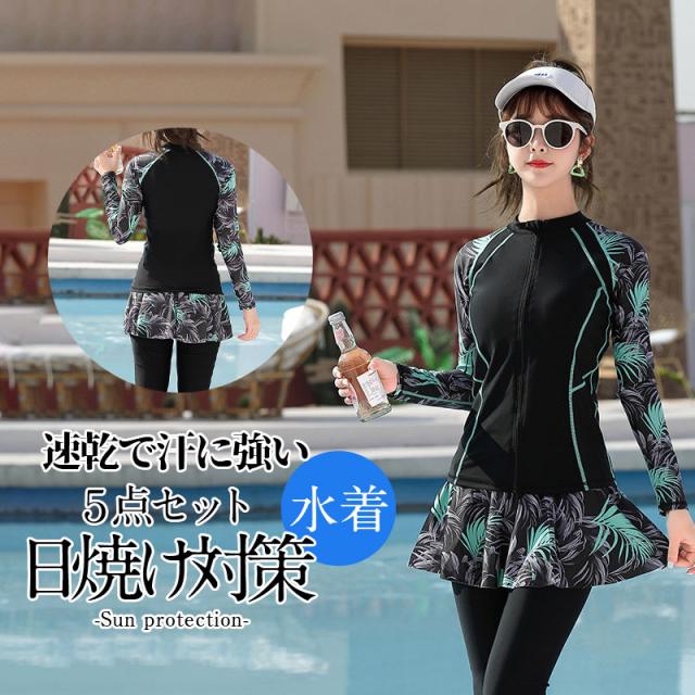 【水曜日まで!10%クーポン配布中】 水着 レディース 40代 50代 体型カバー ラッシュガード 5点セット 長袖 ママ タンキニ水着 フィットネス 大きいサイズ 日