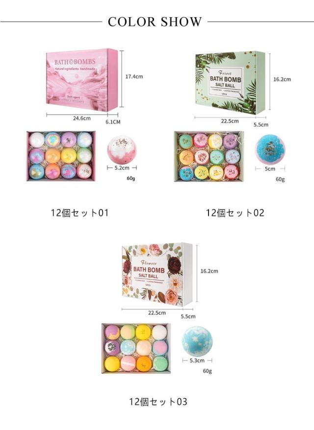 | サイズについての説明 | サイズ:12個セット01:24.6*17.4*6.1cm バスボール:直径 5.2cm 重量約60g 12個セット02:22.5*16.2*5.5cm バスボール:直径5cm 重量約60g 12個セット03:22.5*16.2*5.5cm バスボール:直径5.3cm 重量約60g ※サイズ計測には誤差が生じます。 |