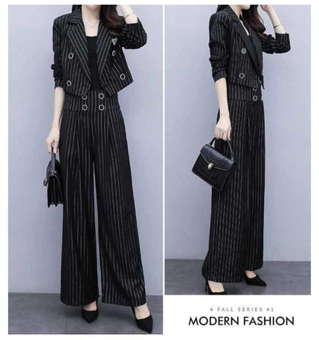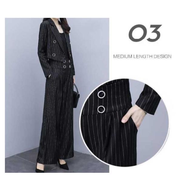 | ショート丈ジャケットとワイドパンツのセットアップ。 トレンドで定番のストライプ生地を採用。 ボトムスはほどよくゆとりのあるシルエットでストレスフリー。 パンツのウエストの後ろがゴム入りなので美スタイルと楽チンも兼備。 卒業式、入学式、卒園式、成人式お祝い、入園式、食事会、七五三、就活、セレモニなど、幅広く使えるセットアップ。 | |