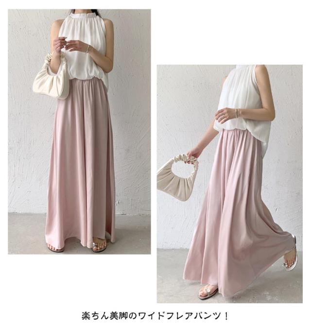 | 穿き心地がたまらなく心地良い♪楽ちん美脚のワイドフレアパンツ! ラクなだけじゃない。計算された美フレアはいろんなスタイルに合う万能ボトム! 身体のシルエットを美しく魅せてくれるだけでなく、動きやすさもバツグンです◎ ウエストまで優しくフィットして引き締めるハイウエストリブ仕様で大人にうれしいデザイン! 柔らかくも弾力のある優秀ストレッチ素材!とろんと艶めく光沢感の上品サテンワイドパンツ。 | |
