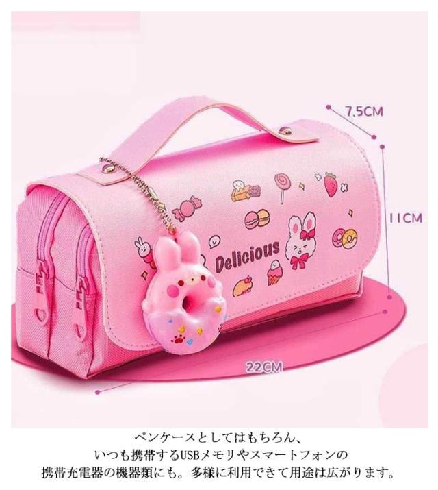 | 文房具がたっぷり収納できるかわいい大容量ペンケースが登場。 ぐるっと大きく開いて、いるものが見つけやすい。ダブルファスナーでペン、消しゴム、付箋、ハサミ、修正テープなど用途を分けて収納が可能です。 レザー調のフラップはマジックテープが付いているので、開閉しやすくなっており、持ち手が付いているのでペンケースの持ち運びに便利! ペンケース本体は良質のキャンバス生地で耐久性が高い、長くご愛用いただけます。 ストレス解消スクィーズを付き。可愛くてとっても便利なスグレモノ! ペンケースとしてはもちろん、いつも携帯するUSBメモリやスマートフォンの携帯充電器の機器類にも。多様に利用できて用途は広がります。 | |