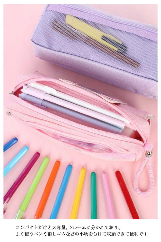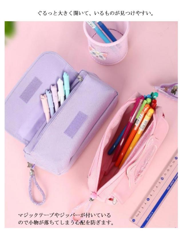 | 文房具がたっぷり収納できるかわいいペンケースが登場。 コンパクトだけど大容量。2ルームに分かれており、よく使うペンや消しゴムなどの小物を分けて収納できて便利です。 ぐるっと大きく開いて、いるものが見つけやすい。大容量でペンや鉛筆だけでなくハサミ等の小物もしっかり入る! 軽量なので持ち運びもラクラク。マジックテープやジッパーが付いているので小物が落ちてしまう心配を防ぎます。 ペンケースとしてはもちろん、コスメポーチとしてもお使いいただけます。 | |