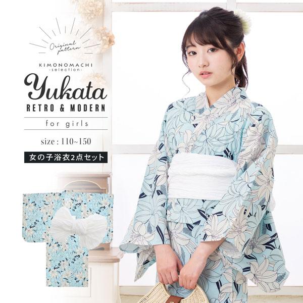 浴衣 子供 女の子 子供浴衣セット(浴衣+帯) 浴衣2点セット「スカイブルー 百合」110cm/120cm/130cm/140cm/150cm こども 子ども キッズ ジュニア ゆかた 花火大会 夏祭り 夕涼み yukata set【メール便不可】