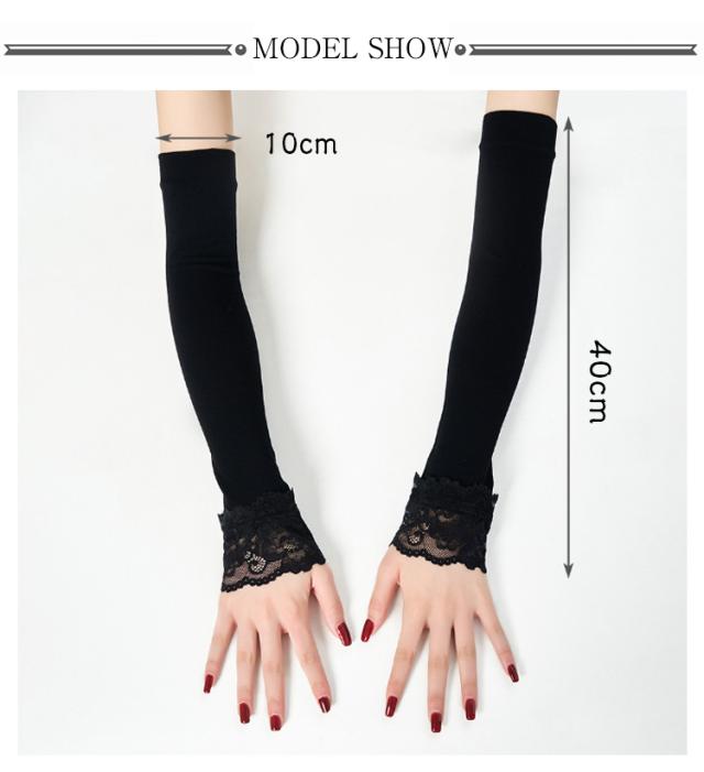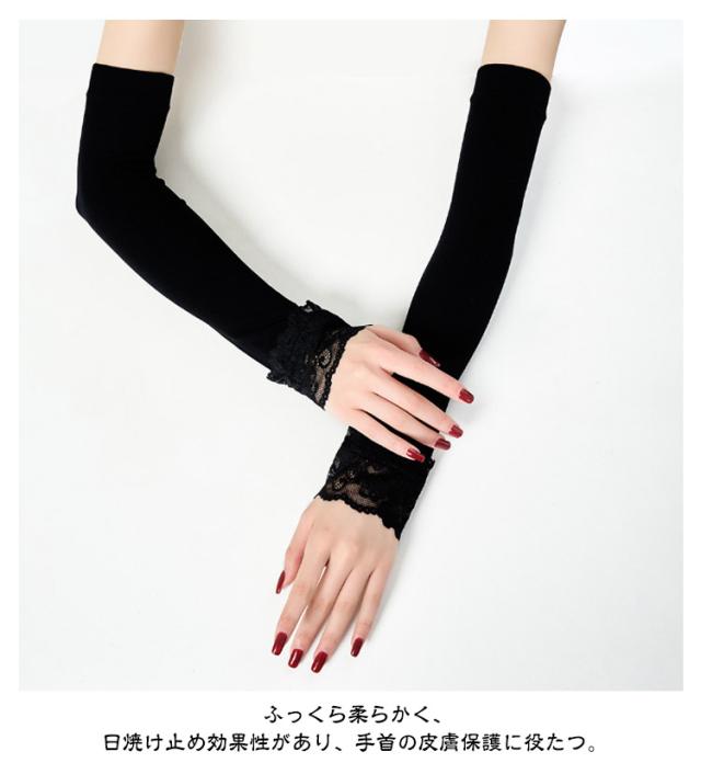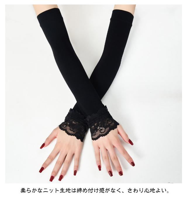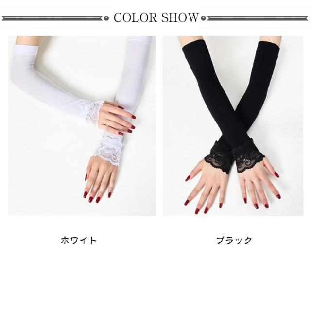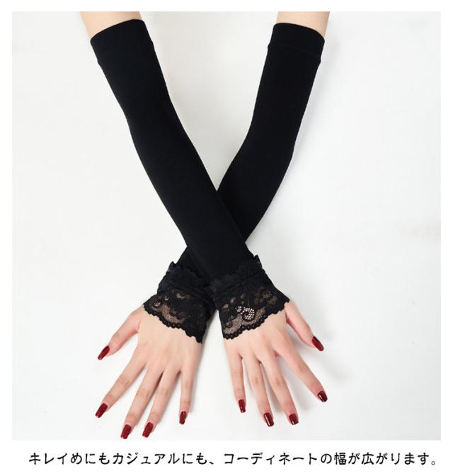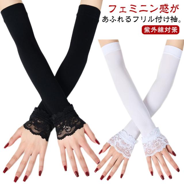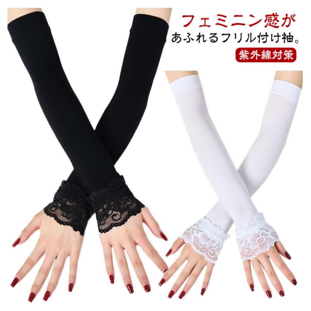 夏 春 ロング レース つけ袖 付け袖 フリル ふんわり 腕カバー アームカバー 接触冷感 付け袖 重ね着 かわいい レイヤード ニット 薄手 おしゃれ かわいい 小物 日焼け止め 紫外線対策 ブラック ホワイト 白