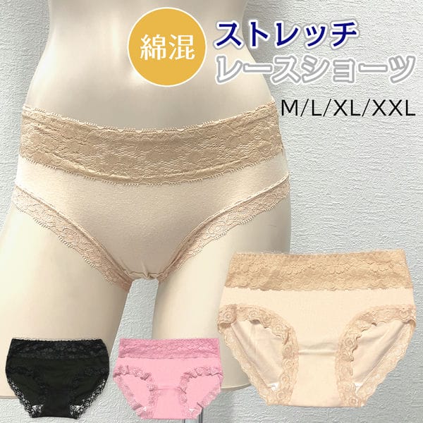 ショーツ 綿混ストレッチ レースショーツ レディース インナー 下着 綿 コットン ふつう丈 レギュラー丈 快適 華やか 可愛い おしゃれ 女性 柔らかい 優しい 伸縮性 響きにくい M/L/XL/XXL ブラック ベージュ ピンク 100261