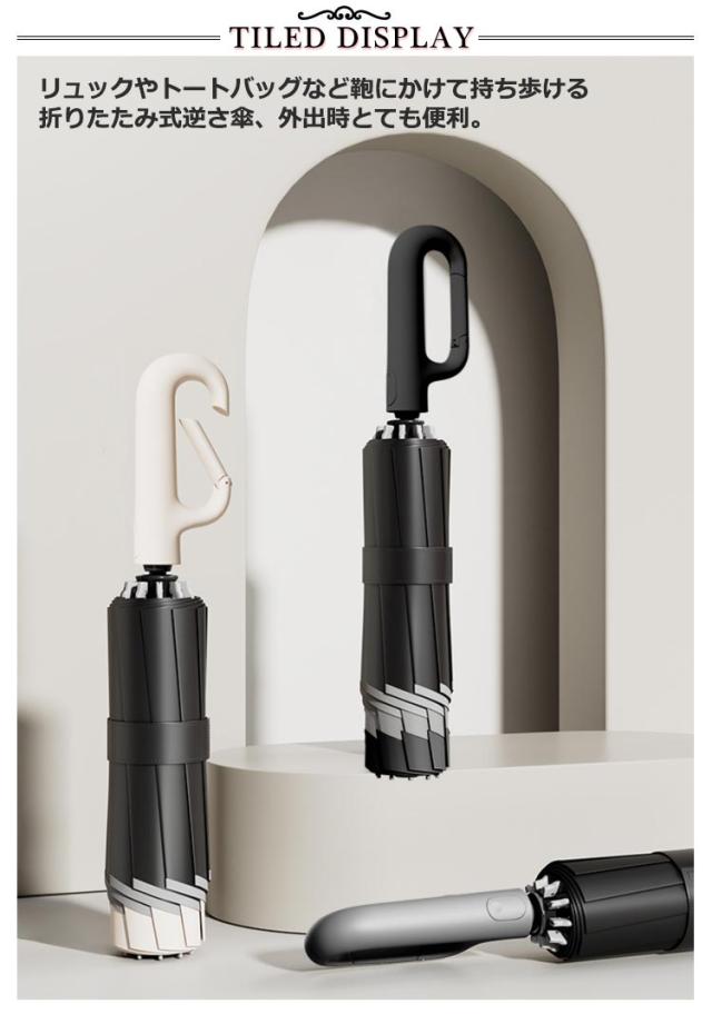 | 吊り下げ仕様のO型持ち手でとっても便利!折りたたみ逆さ傘。 折り畳めるからコンパクトに収納できるから、カバンに入れて携帯も便利。 逆折り式傘なので、外側の濡れた面に触れずに畳めるから、雨の日車内に置いても♪ 急な雨にも強い日差しにも対応できるので日常使いにぴったりです。 傘を開く時は、ハンドルをしっかりと握って手元のボタンを押すだけ! アルミニウム合金の材質で、強風に耐えられる高密度グラスファイバーを採用し、豪雨や強風にも安心◎ 大人ふたりが並列、カバー範囲をもっと大きく! シンプルデザインでビジネスやカジュアルな服に似合います。 | |