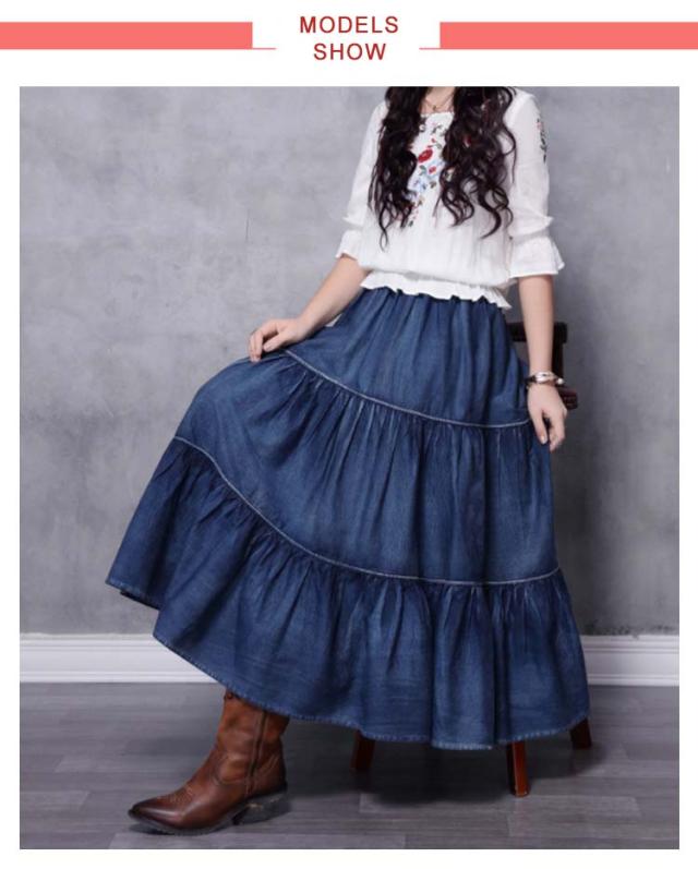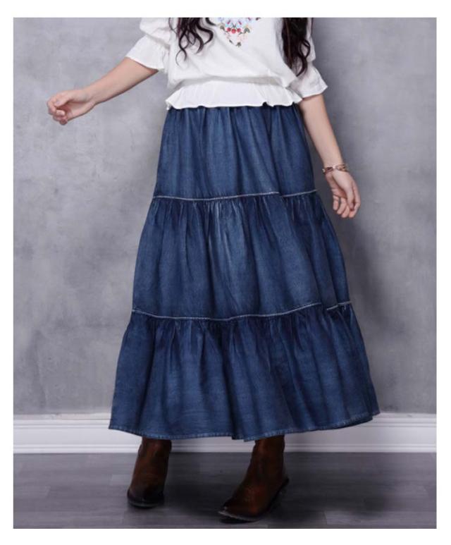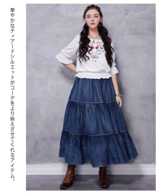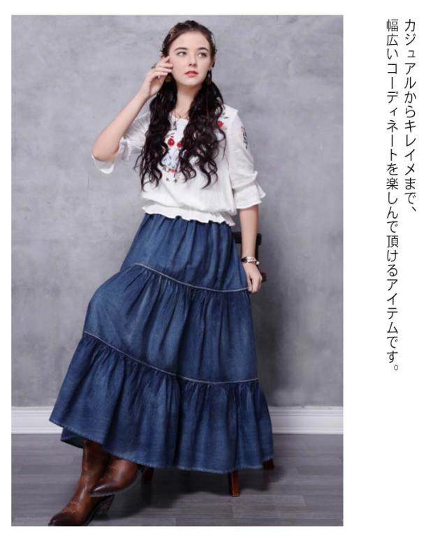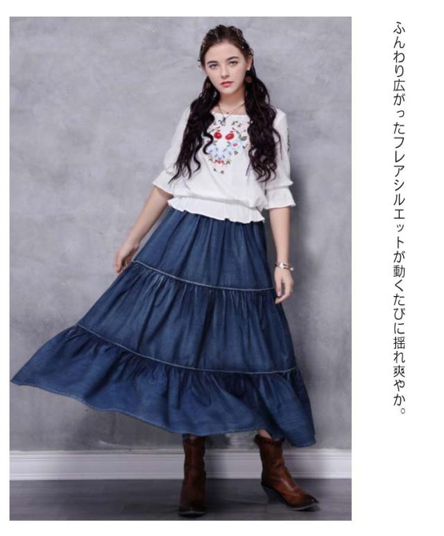 ロングスカート ティアード レディース デニムスカート スカート マキシスカート フレアスカート ロング マキシ丈スカート コットン きれいめ デニム ウエストゴム カジュアル ゆったり ボトムス 春 夏 秋 冬 体型カバー 大きいサイズ
