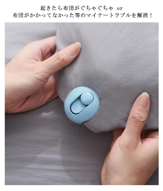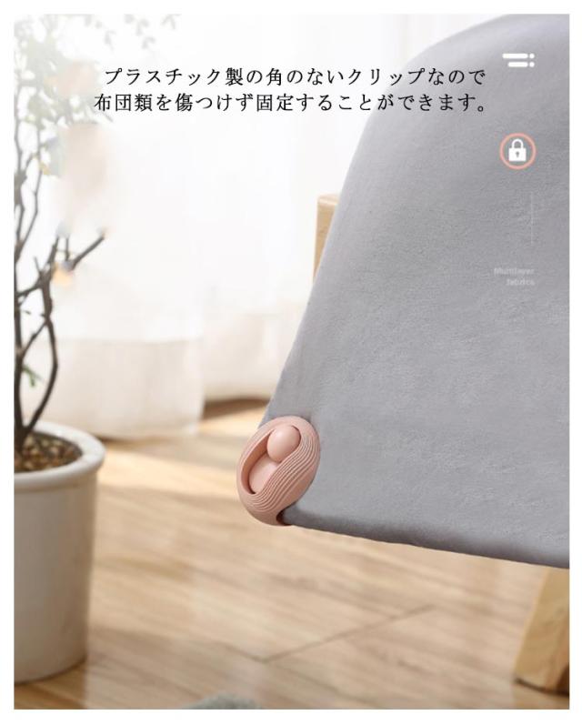 | プラスチック製の角のないクリップなので布団類を傷つけず固定することができます。 布団や毛布、シーツのずれを予防する便利なアイテムです。 起きたら布団がぐちゃぐちゃ or 布団がかかってなかった等のマイナートラブルを解消! 布団のズレを予防し、暖かさを逃がしません。 | |