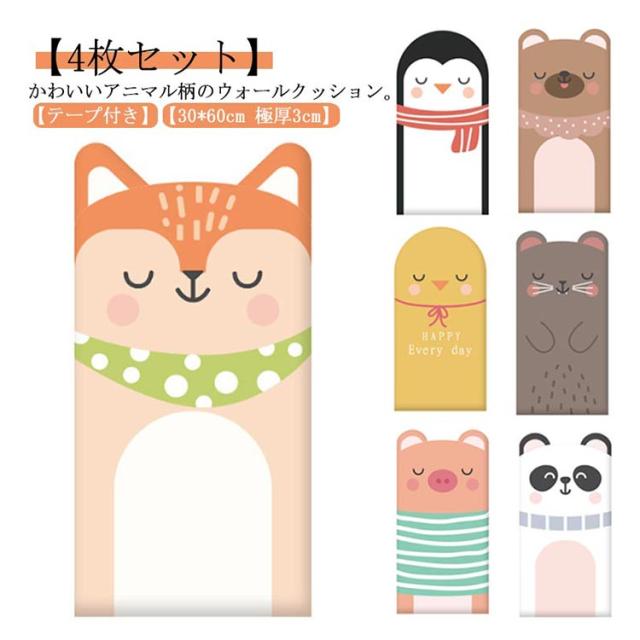 壁クッション 30*60cm 厚さ3cm キッズ 壁マット 赤ちゃん ベビーガード 防水 極厚 ウォールクッション かわいい コーナークッション 子供 テープ付き 厚手 安全マット 4枚セット アニマル柄 防音 防カビ 無毒性 衝撃吸収 ケガ防止 幼稚園