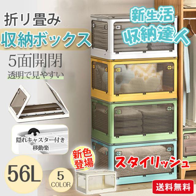 【即納品】収納ボックス 折りたたみ 56L大容量5面開閉 透明ボックス 隠れキャスター付き 組立簡単 コンテナー 衣装布団 収納ケース プラスチック 積み重ね 新生活 おしゃれ 物入れ 移動便利 コンパクトagesugi_sis